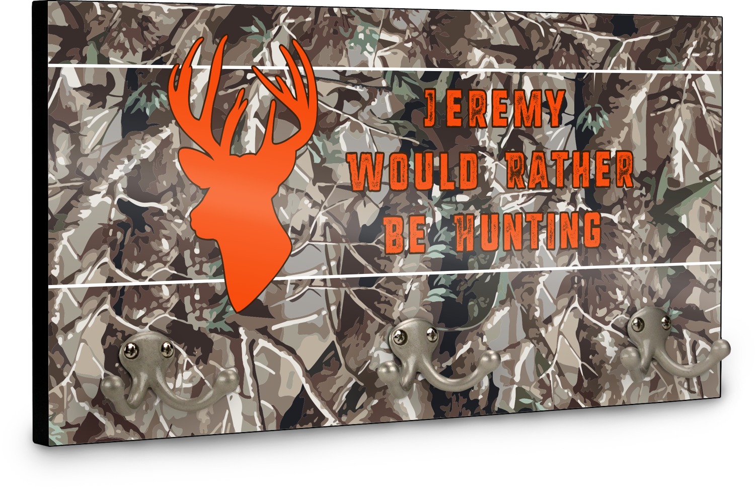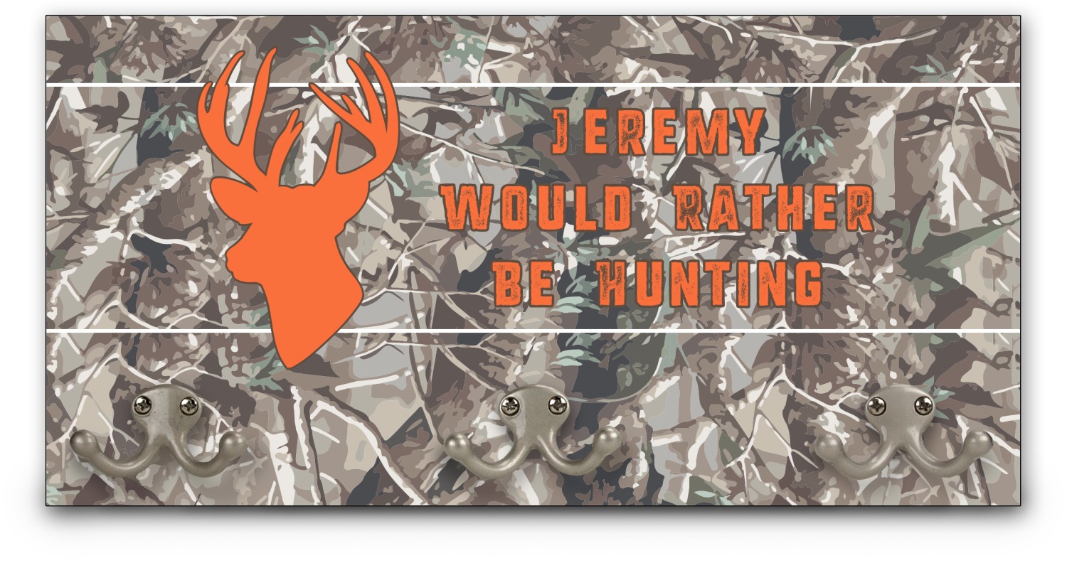 This coat rack is the perfect way to add some personality to your wall or entryway. The board is made of a strong maple that is approximately 16" x 8". The three 2-prong hooks are a sturdy metal that have three screws attaching them to the board. Your design is printed right onto the front of the board while the back and sides are a simple black.