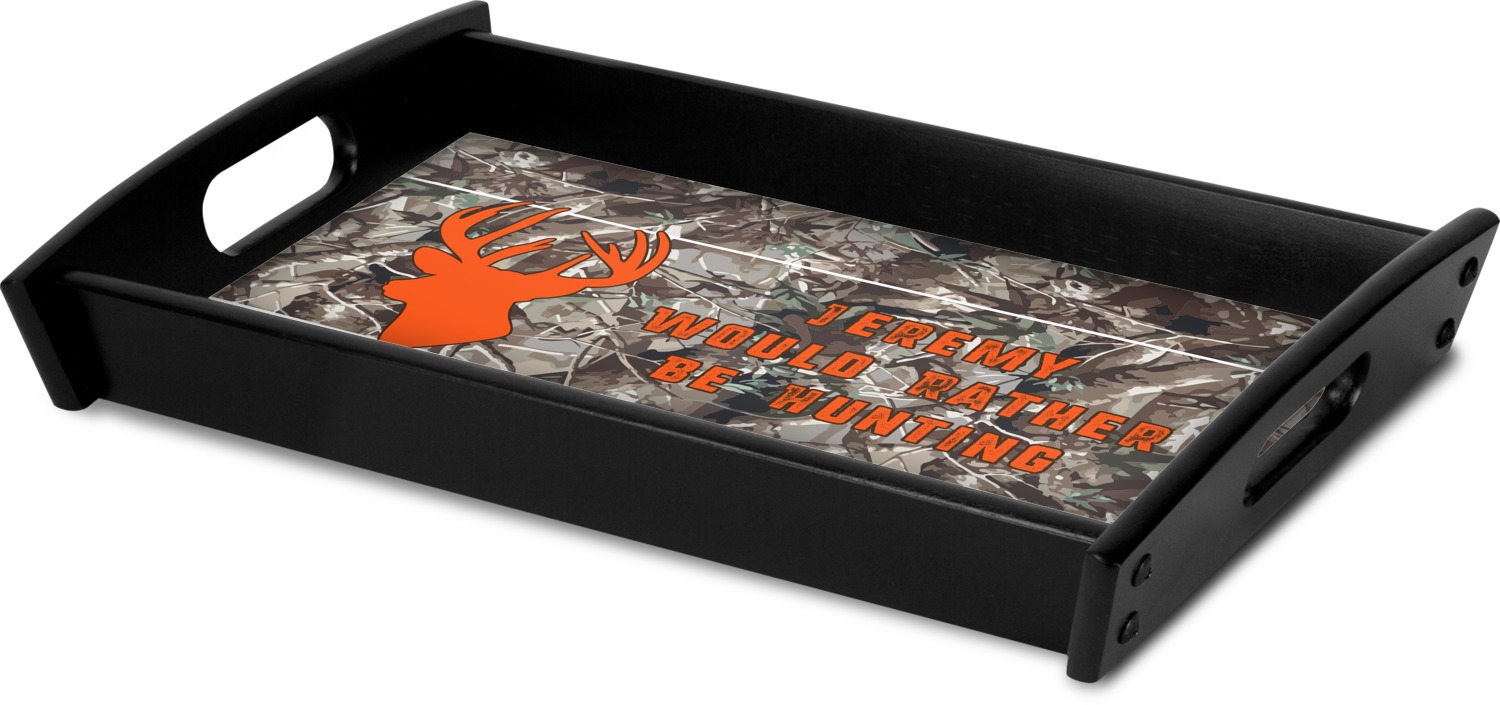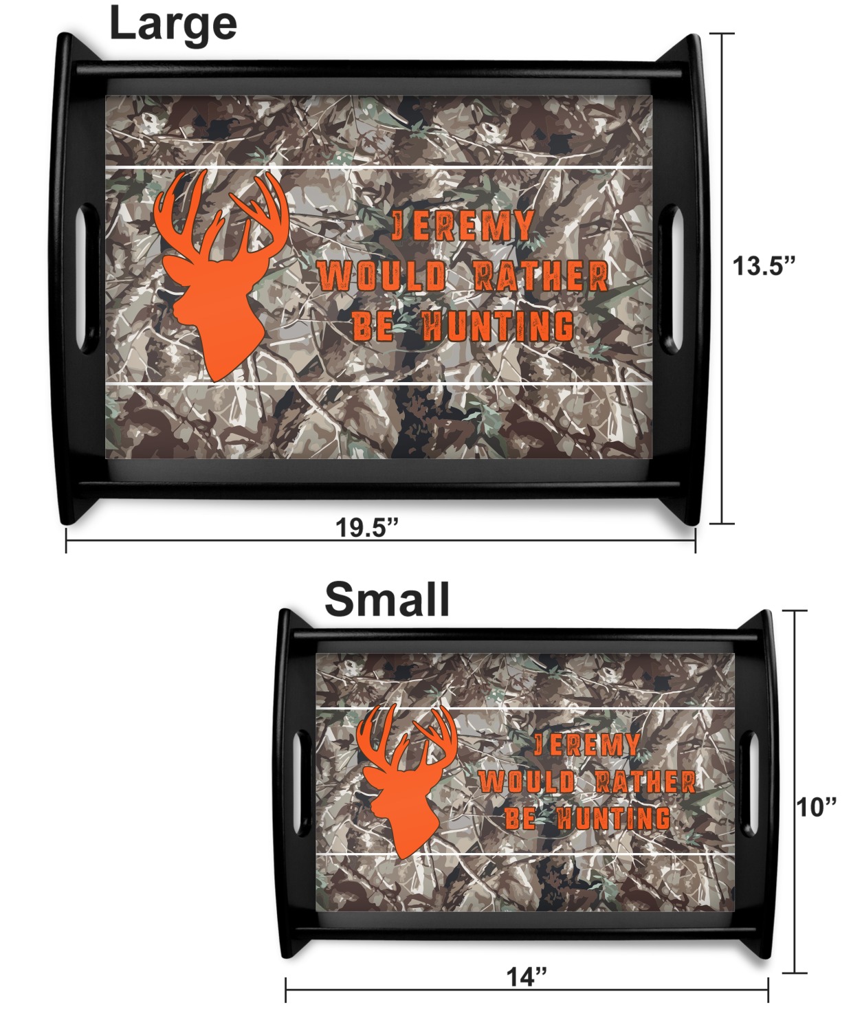 This serving tray with handles features square edges and two rounded sides, creating a very modern look. Each side is fabricated from a beautifully cut, natural wood. The bottom of the interior of the tray displays your customized design in bright, vibrant color. The tray is sold in both a black color and a natural wood look. Each variation of the wood serving tray has two sizes: Small, which is 14" x 10" x 2.25", and Large, which is 19.5" x 13.5" x 2.75".