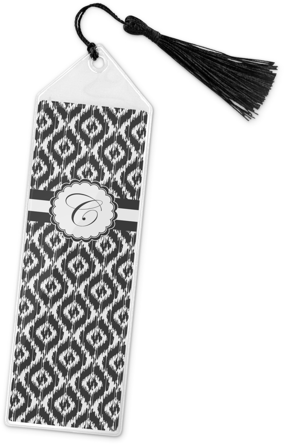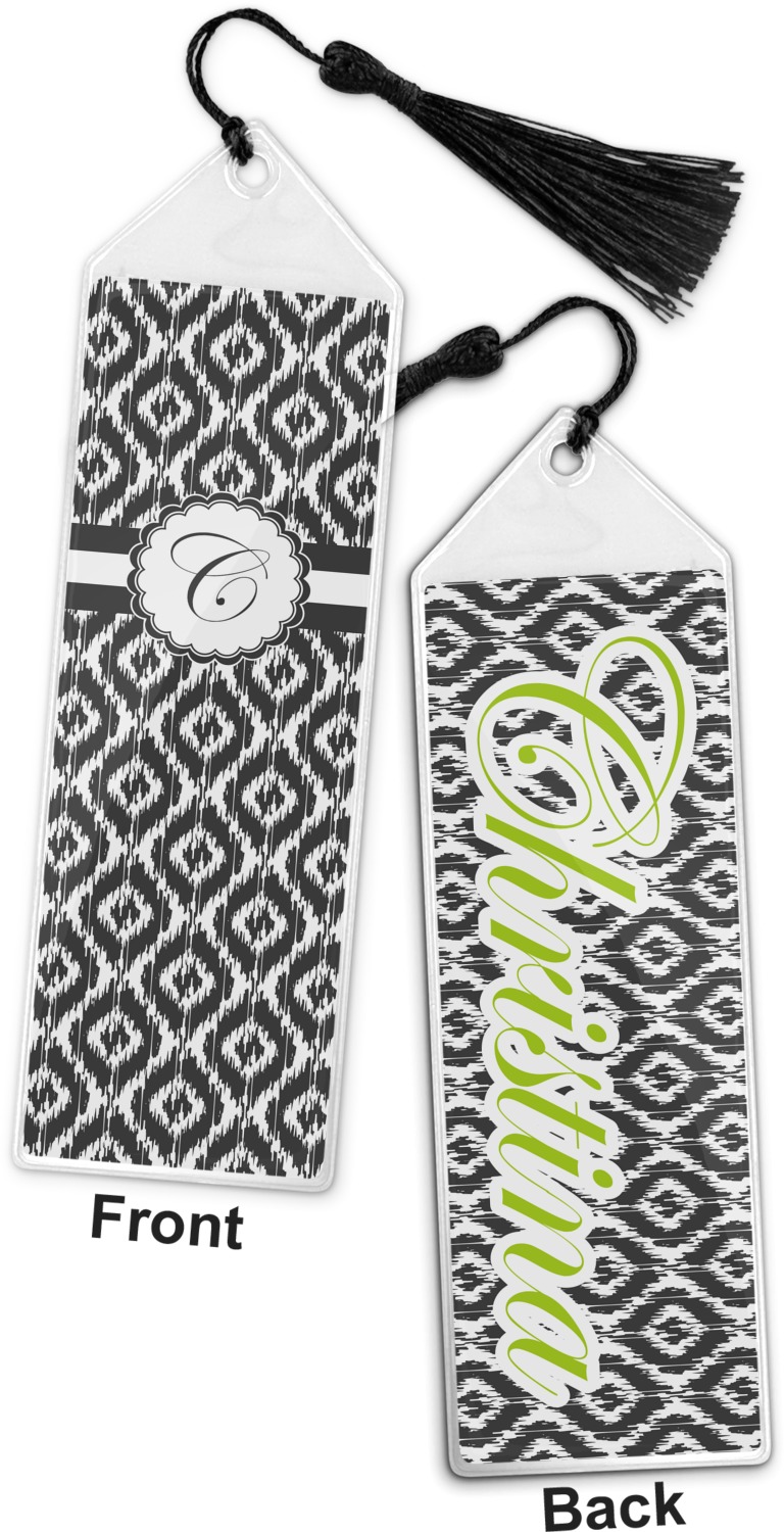 Your personalized bookmark is made of a sturdy, clear vinyl, and is approximately 7.5" x 2.25". We display your personalization on vinyl inserts that are placed on both sides. Accompanying each book marker is a black, fringe tassel that attaches to the reinforced, triangular header.