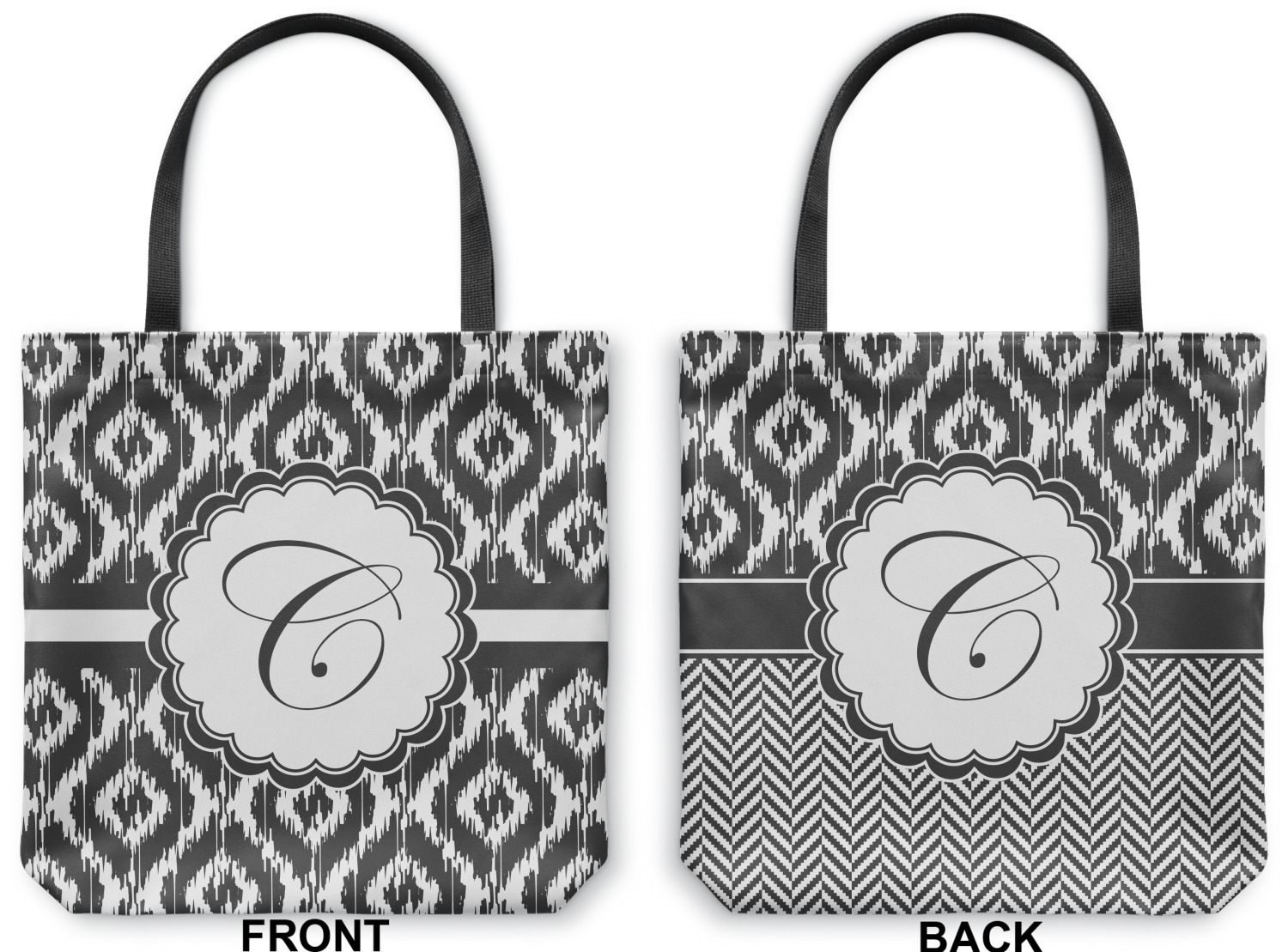 Our totes are made right here in the USA. Your design is printed on canvas fabric; the fabric is then cut and sewn on the sides and on the bottom to add an approximately 3.5 inch gusset. Black cotton handles are sewn in and reinforced. Your tote has a designs on both sides - the designs can be the same or different - the choice is yours. The inside of the tote has a black fused lining.