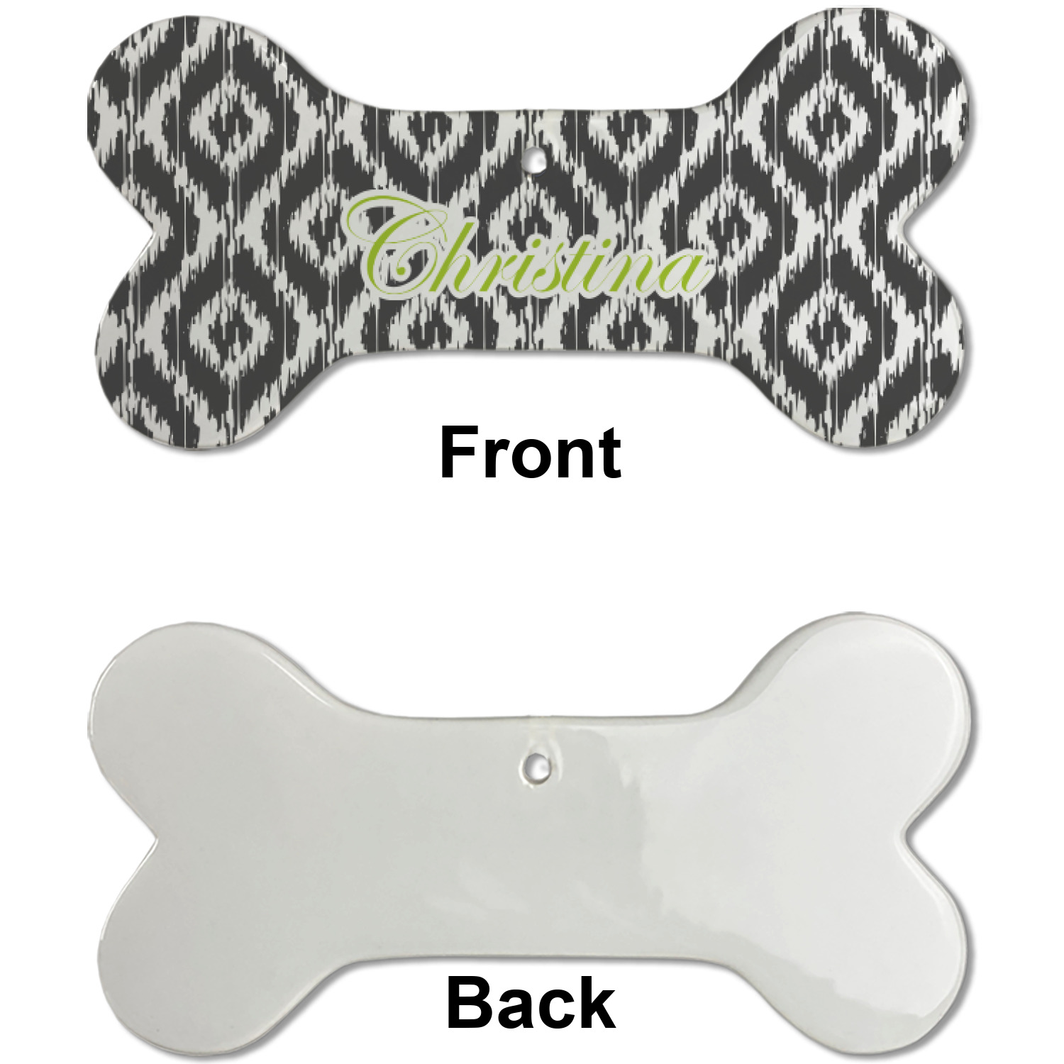 Our dog Christmas ornaments are a ceramic material with a bone-shaped structure hung horizontally. We offer two printing styles to personalize your furry friend's ornament! Choose a one-sided printing, perfect for wall decor, memorial accessory, or doghouse nameplate! Create a double-sided ornament perfect for adorning the Christmas tree. Each dog bone ornament is approximately 4.75" x 2.25" and is printed here in the USA.