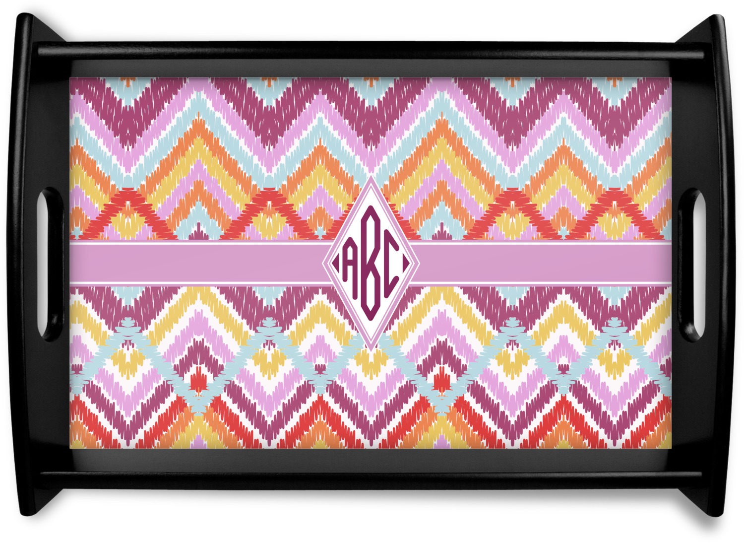 This serving tray with handles features square edges and two rounded sides, creating a very modern look. Each side is fabricated from a beautifully cut, natural wood. The bottom of the interior of the tray displays your customized design in bright, vibrant color. The tray is sold in both a black color and a natural wood look. Each variation of the wood serving tray has two sizes: Small, which is 14" x 10" x 2.25", and Large, which is 19.5" x 13.5" x 2.75".