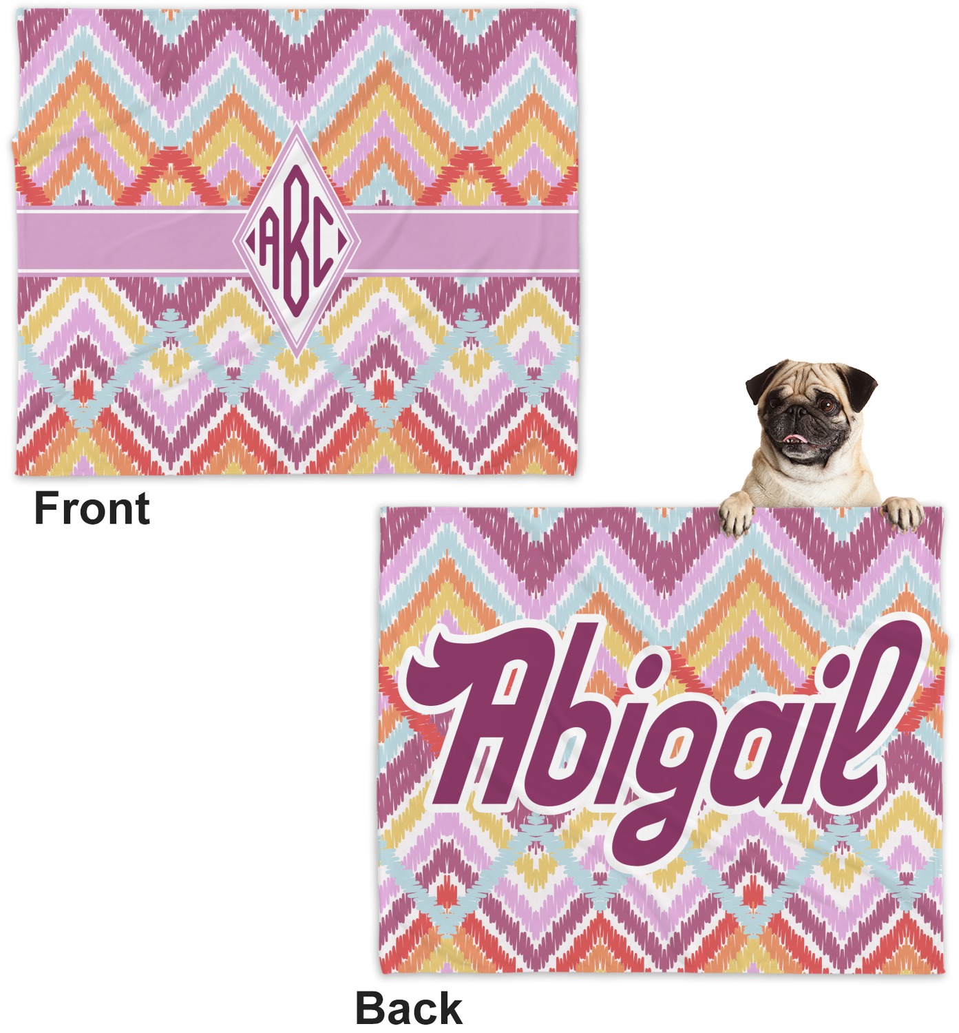 These dog blankets are crafted from a gentle, soft-to-the-touch, minky material. We print your customizations, either matching or differing, on both the top and underside of the blanket. These personalized dog blankets are available in two sizes: regular and large. Our regular size, at 40" x 30", accommodates small and some medium size dogs. At 60" x 50", our large dog blanket is a better fit for bigger breeds. Though specialized for dogs, these blankets still make a thoughtful gift for your favorite feline, or any other pet in mind!