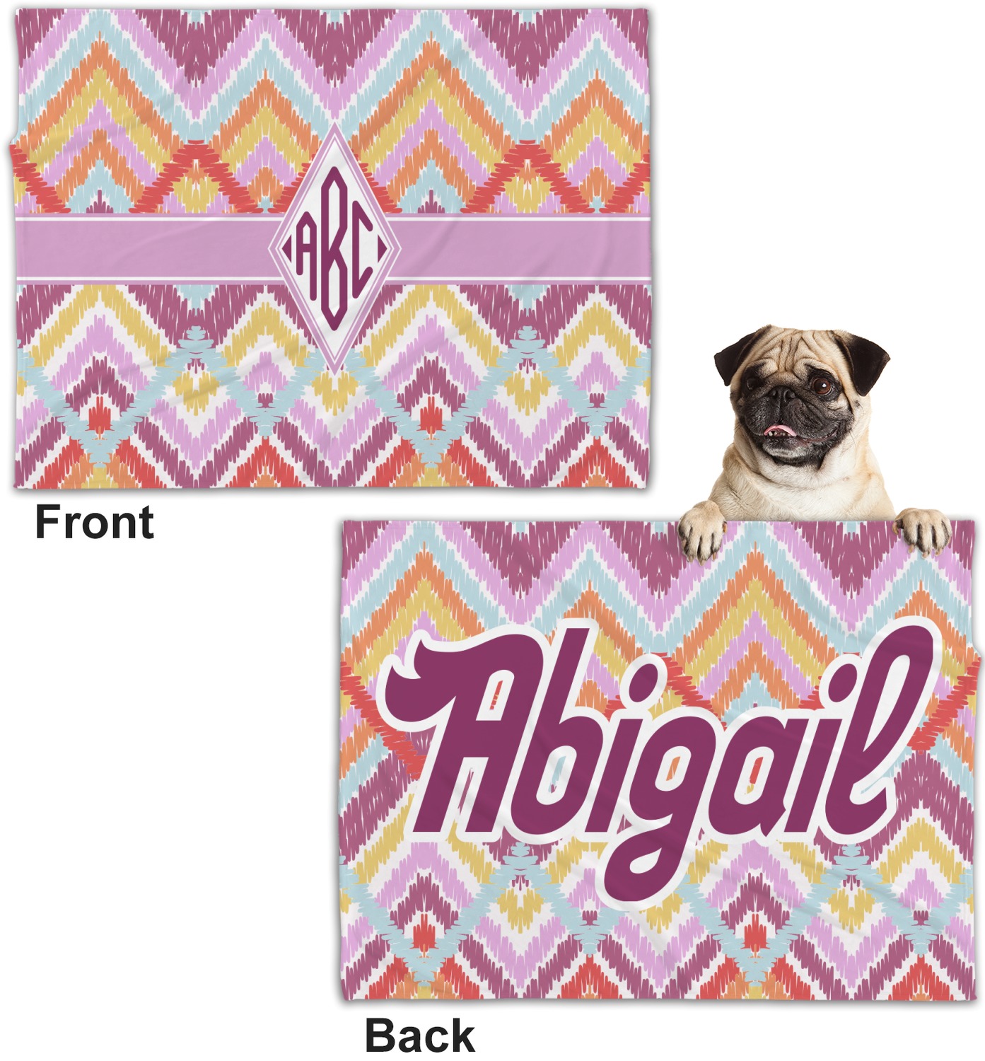 These dog blankets are crafted from a gentle, soft-to-the-touch, minky material. We print your customizations, either matching or differing, on both the top and underside of the blanket. These personalized dog blankets are available in two sizes: regular and large. Our regular size, at 40" x 30", accommodates small and some medium size dogs. At 60" x 50", our large dog blanket is a better fit for bigger breeds. Though specialized for dogs, these blankets still make a thoughtful gift for your favorite feline, or any other pet in mind!