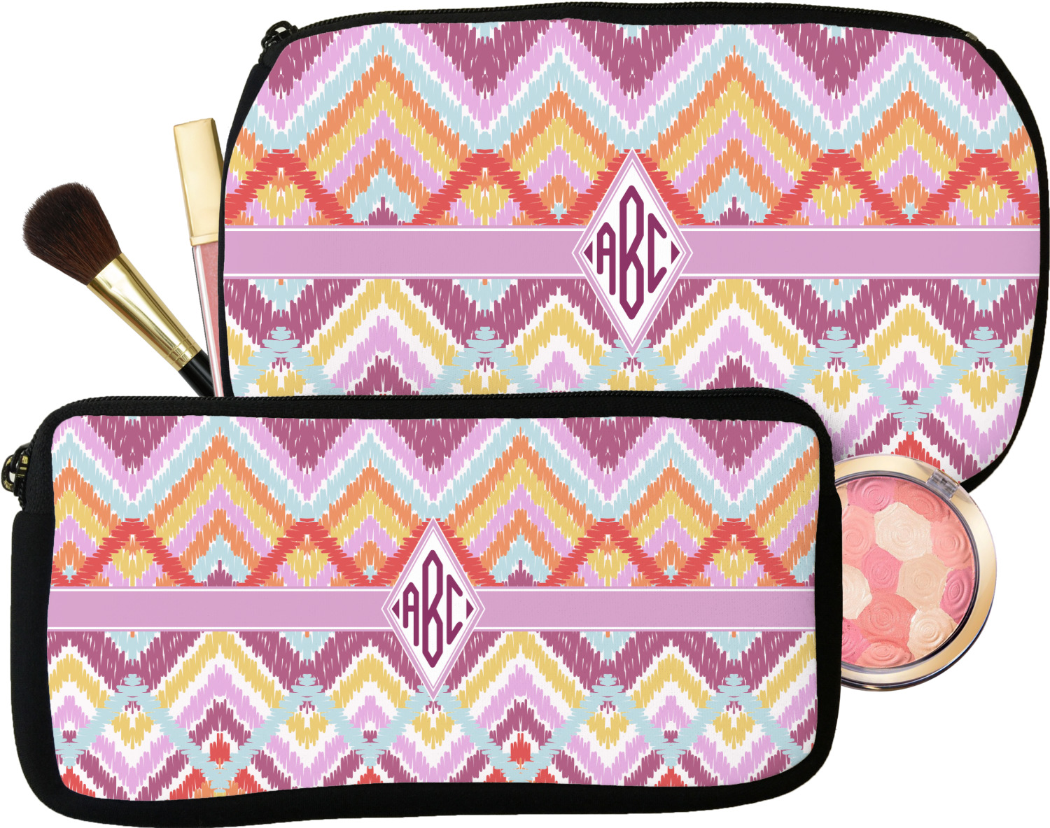 Our personalized makeup bags are available in many different designs, patterns and colors - so you are sure to find one that will love. They are made of neoprene (same material as wet-suits) and thus are water resistant, so spillages in your makeup bag will not end up all over you purse. They are customized on one side and are black on the other side and the zipper is black as well.