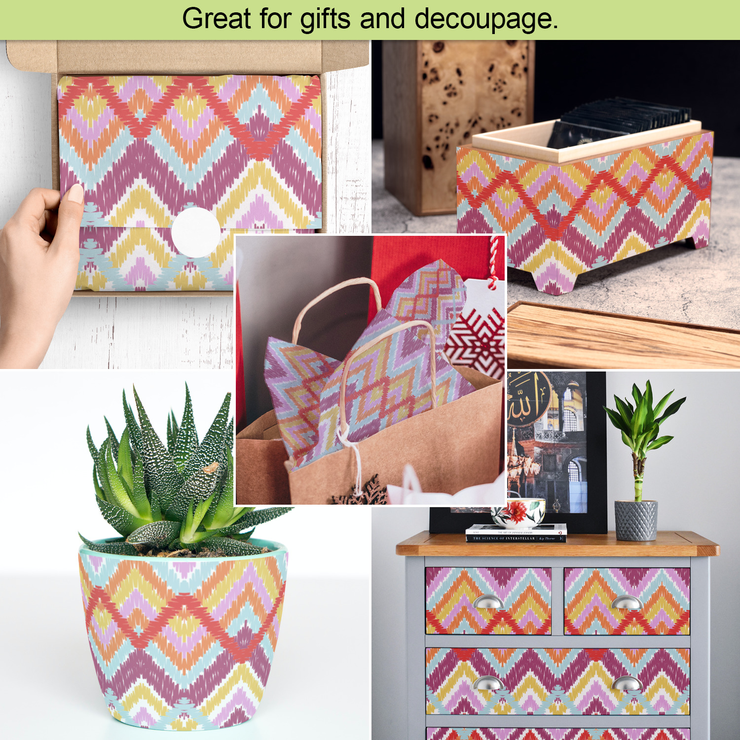 Our tissue paper sheets are also perfect for decoupage i.e. the art of gluing paper on ordinary objects to decorate them.