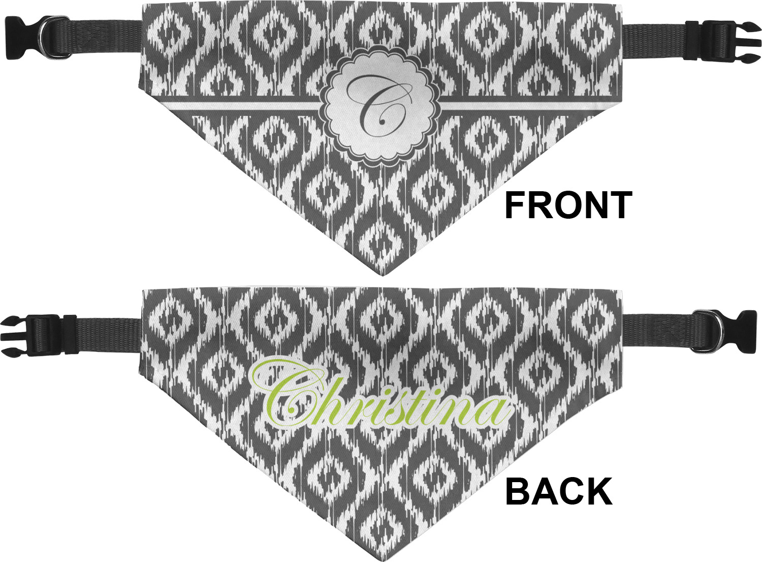 We print the front and back of these dog bandanas with your customized design. The bandana itself is made from a durable polyester, sewn together with a gap large enough to accommodate any collar. Regardless, the bandana includes a plain black, canvas collar with plastic snaps, that can easily be removed if desired. These dog bandana collars are available in four sizes: small, medium, large, and extra large. Please see our sizing chart for more information regarding the dimensions of each size.