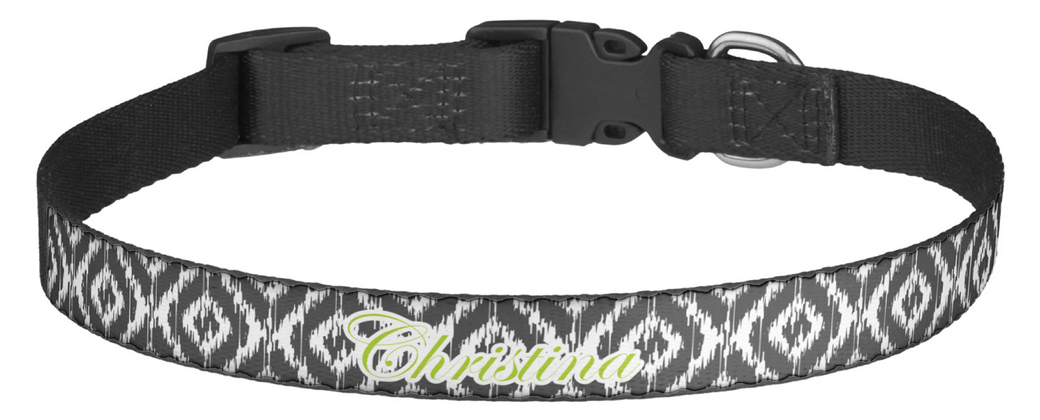 This sturdy collar, made from a durable nylon weave, will outlive your dog's episodes of excited tugging and pulling. Courtesy of its thick plastic buckle and adjuster, this collar is adjustable and accommodating of any dog. Structurally, the collar is a single piece of nylon weave that is sewn together, and features a solid metal loop where you can attach a leash or dog tag. We print and display your dog's name and pattern across the middle of the personalized dog collar.