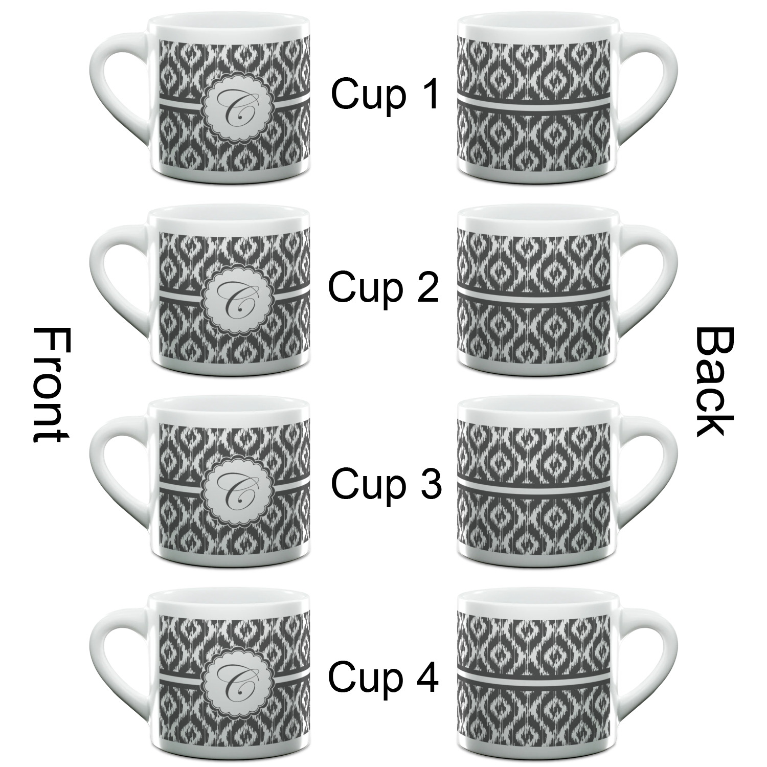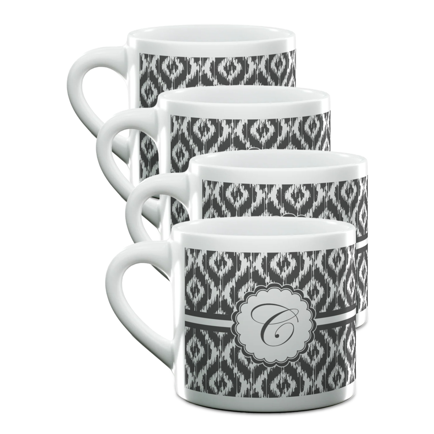 Each of our espresso mugs is a ceramic material sure to keep your drink warm. Personalize one cup for yourself, or order a set of 4! Its the perfect little gift for any coffee lover! We carry two sizes for you to personalize - 3 oz. (approx. 3.25" x 2.325" x 2.625") or 6 oz. (approx. 4" x 2.9" x 2.9"). Our 3 oz. mug is perfect for that single shot espresso while our 6 oz. mug can be your next favorite cappuccino cup holding two shots of espresso!