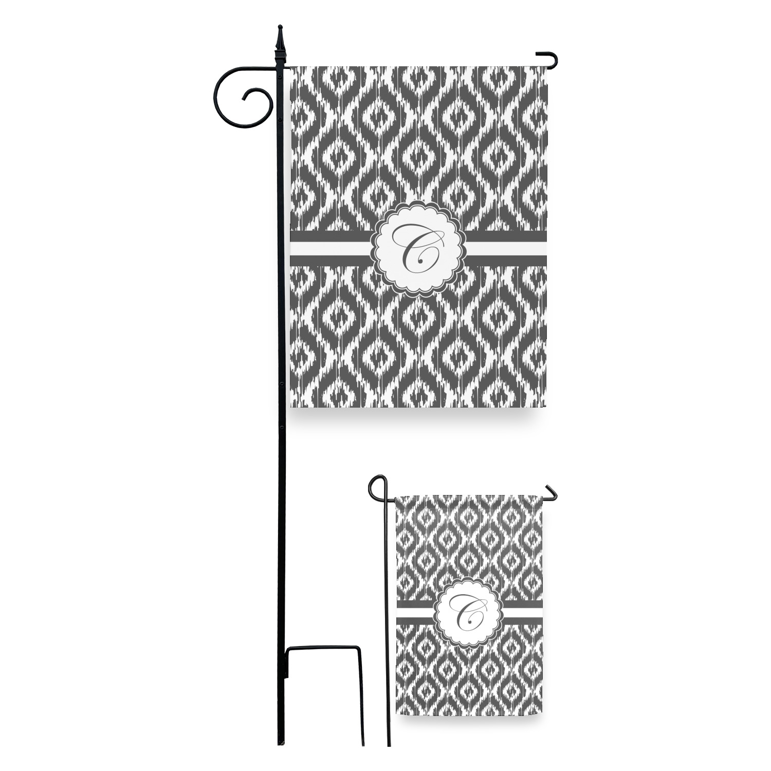 These custom garden flags are made of a durable, double-ply, polyester weave, allowing them to withstand the elements year round. The small flags measure at approximately 12 by 18 inches. The large flags measure out to 28 by 37 inches. You can order these decorative flags with your customization printed on the front only, or the front and back.