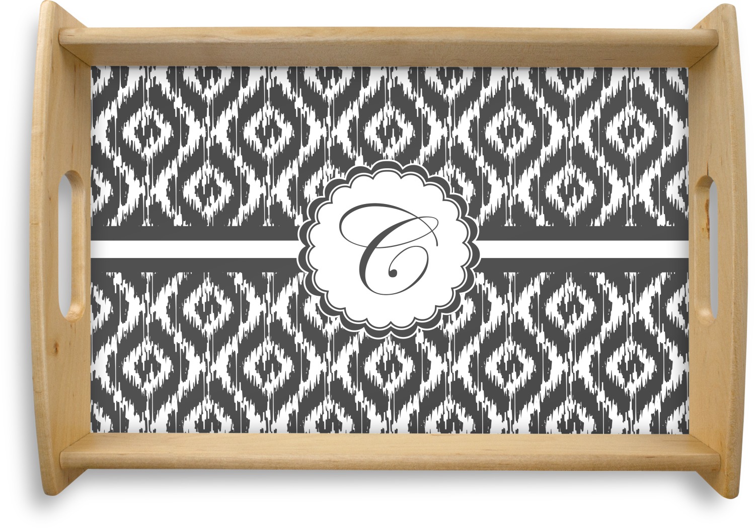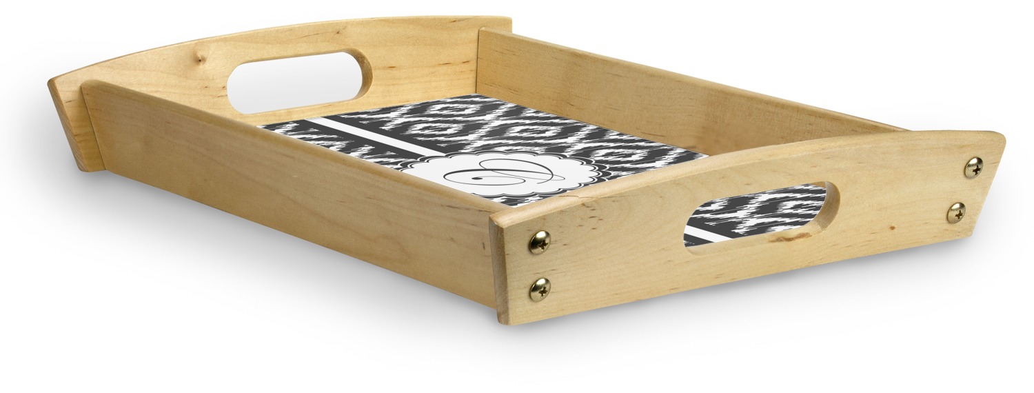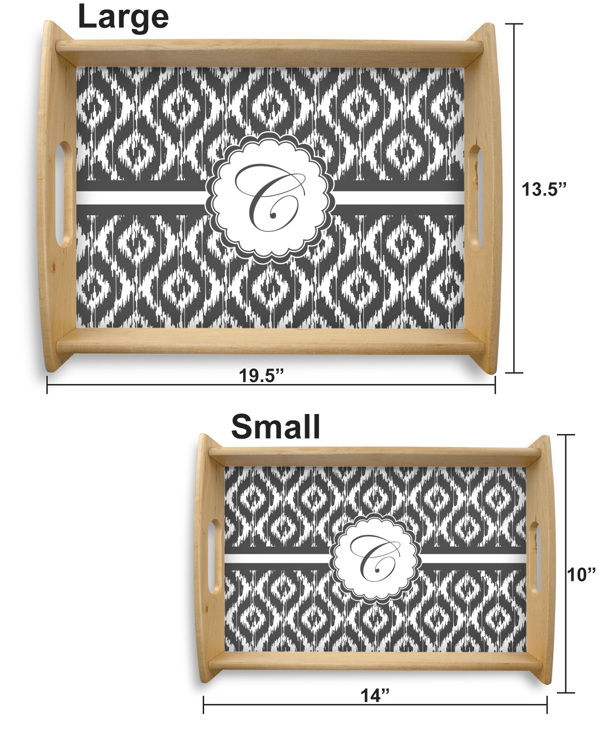 This serving tray with handles features square edges and two rounded sides, creating a very modern look. Each side is fabricated from a beautifully cut, natural wood. The bottom of the interior of the tray displays your customized design in bright, vibrant color. The tray is sold in both a black color and a natural wood look. Each variation of the wood serving tray has two sizes: Small, which is 14" x 10" x 2.25", and Large, which is 19.5" x 13.5" x 2.75".