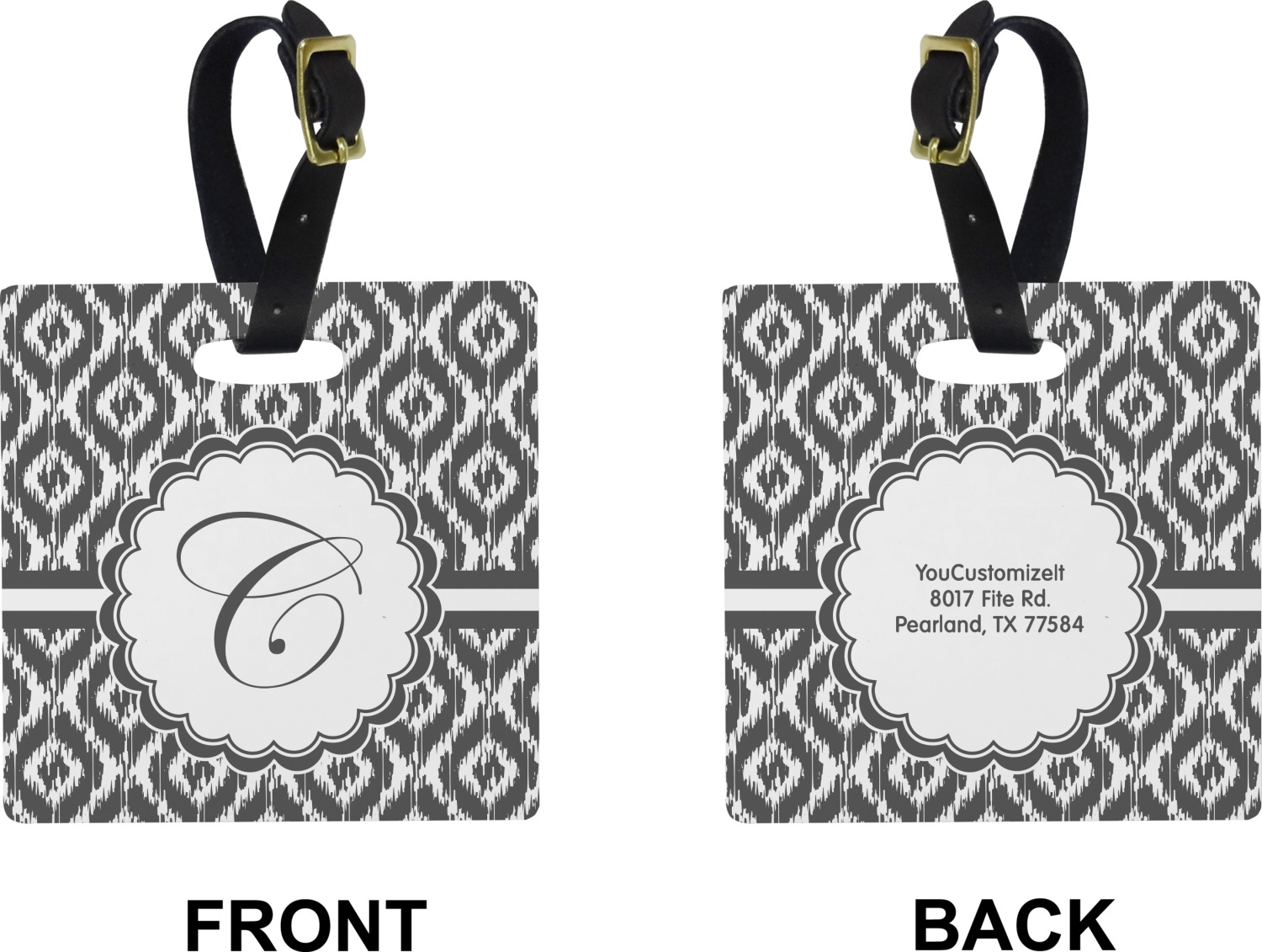 These personalized bag tags are sold in a variety of shapes, so that you may find the product that meets your vision exactly. We sell a round luggage tag, which measures at approximately 4" x 4". Our square luggage tag is about 3.5" x 3.5", while our rectangular version is 2.75" x 4 ".