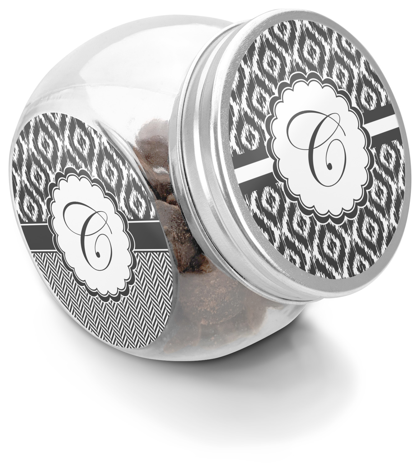 This treat jar is an excellent way to store treats for your favorite canine or feline. Moreover, their delicate, classy appearance makes them a tasteful addition to your countertop's décor. Crafted from clear glass, its unique construction and silver metal, screw-on lid allows for quick and easy access. Three, permanent, vinyl stickers are applied to both sides of the jar and lid, presenting your personalized design. The base of this glass, dog treat jar is 3.4" x 4.75", and the jar stands at 5" tall. Though on the smaller side, this jar is best suited for smaller treats or training treats.