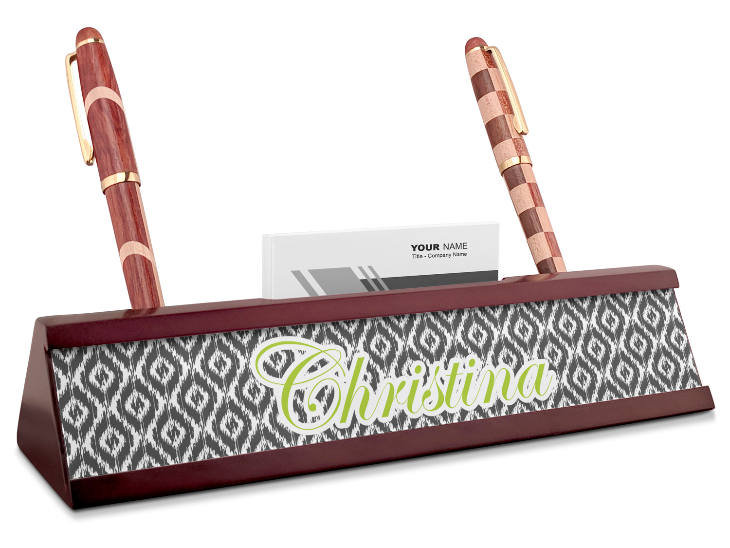 Your desk name plates are crafted from a high-quality, dark-cherry mahogany. At approximately 9.5 by 1.875 by 2.5 inches, this name plaque will fit perfectly, front and center, on your desk. Your customization spans across the entire face of the nameplate. Behind the nameplate lies a skinny slot that can fit approximately 15, traditionally-sized, business cards. You can also store your writing utensils on either side of this custom desk name plate.