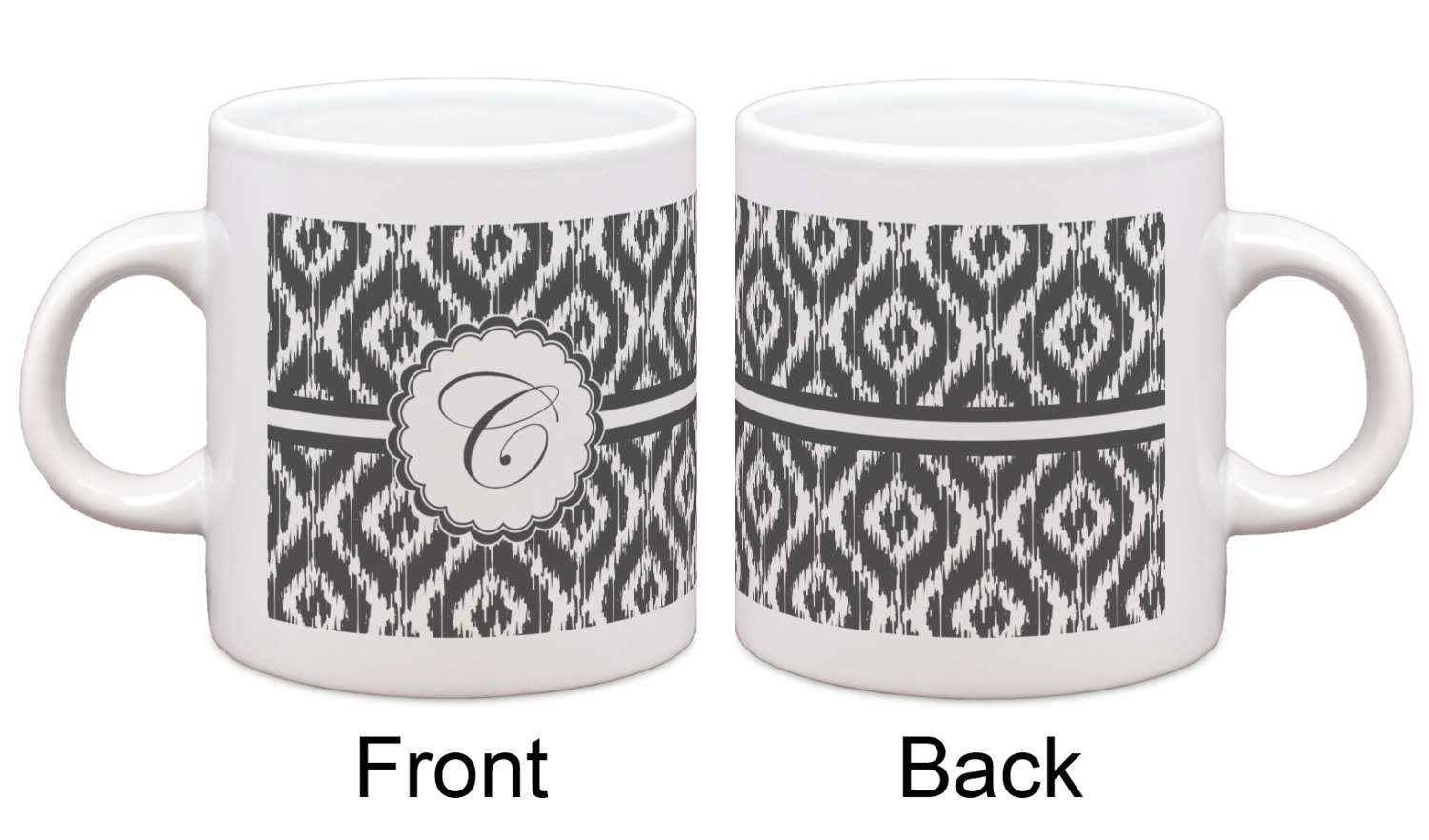 Each of our espresso mugs is a ceramic material sure to keep your drink warm. Personalize one cup for yourself, or order a set of 4! Its the perfect little gift for any coffee lover! We carry two sizes for you to personalize - 3 oz. (approx. 3.25" x 2.325" x 2.625") or 6 oz. (approx. 4" x 2.9" x 2.9"). Our 3 oz. mug is perfect for that single shot espresso while our 6 oz. mug can be your next favorite cappuccino cup holding two shots of espresso!
