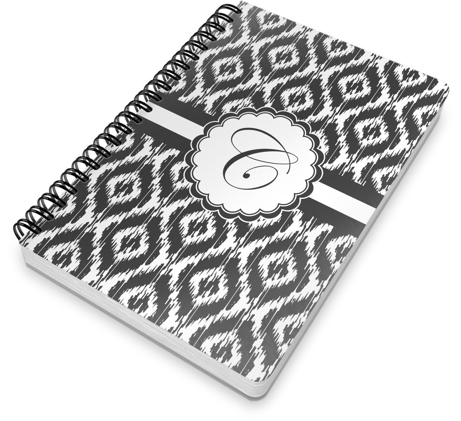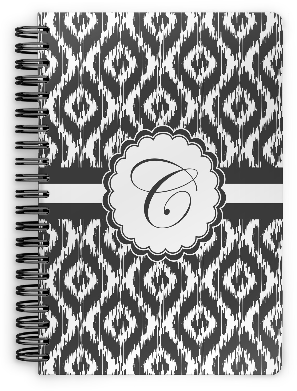This spiral notebook includes 75 sheets of thick, ruled paper. The front and back of this custom notebook is made of a robust, laminate, plastic covering. We print your personalization on these two panels, underneath a glossy finish, which emphasizes the colors of your design. The two panels and the sheets of paper are held together by a sturdy, black coil. The paper within your bound notebook is perforated for easy, clean tearing.
