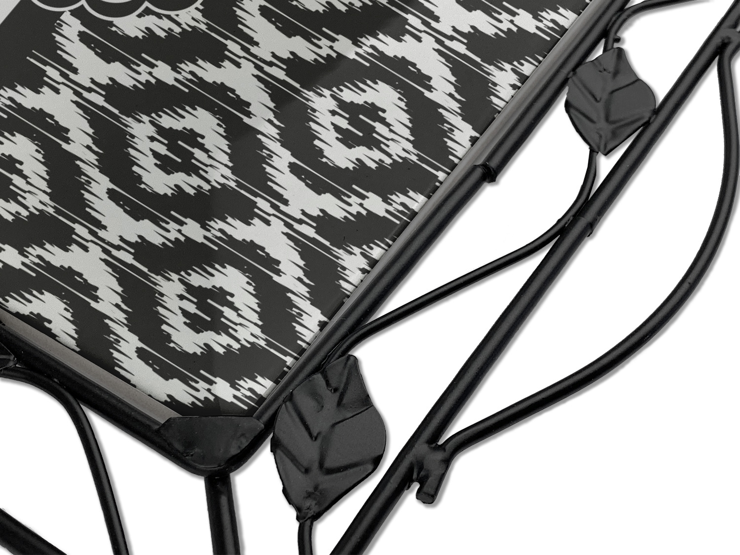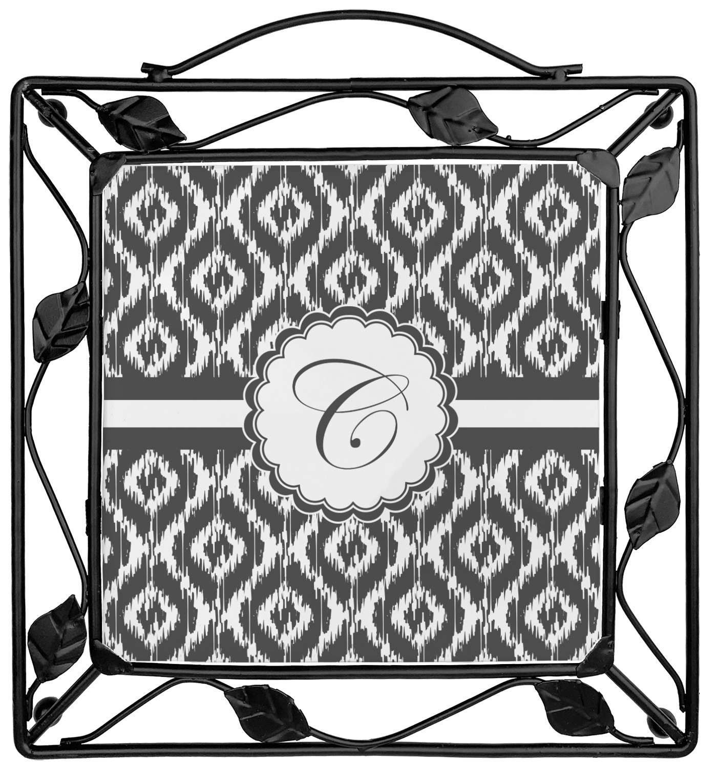 Our square trivets are made from a durable, wrought iron. This model features 4 small half circles, one on each corner, and a larger ring of iron that circles the central, customized tile. Each of the 4 corners has a round foot on its bottom for stability. This trivet is 8.75 by 8.75 inches, but the central tile measures at 6 inches on both sides.