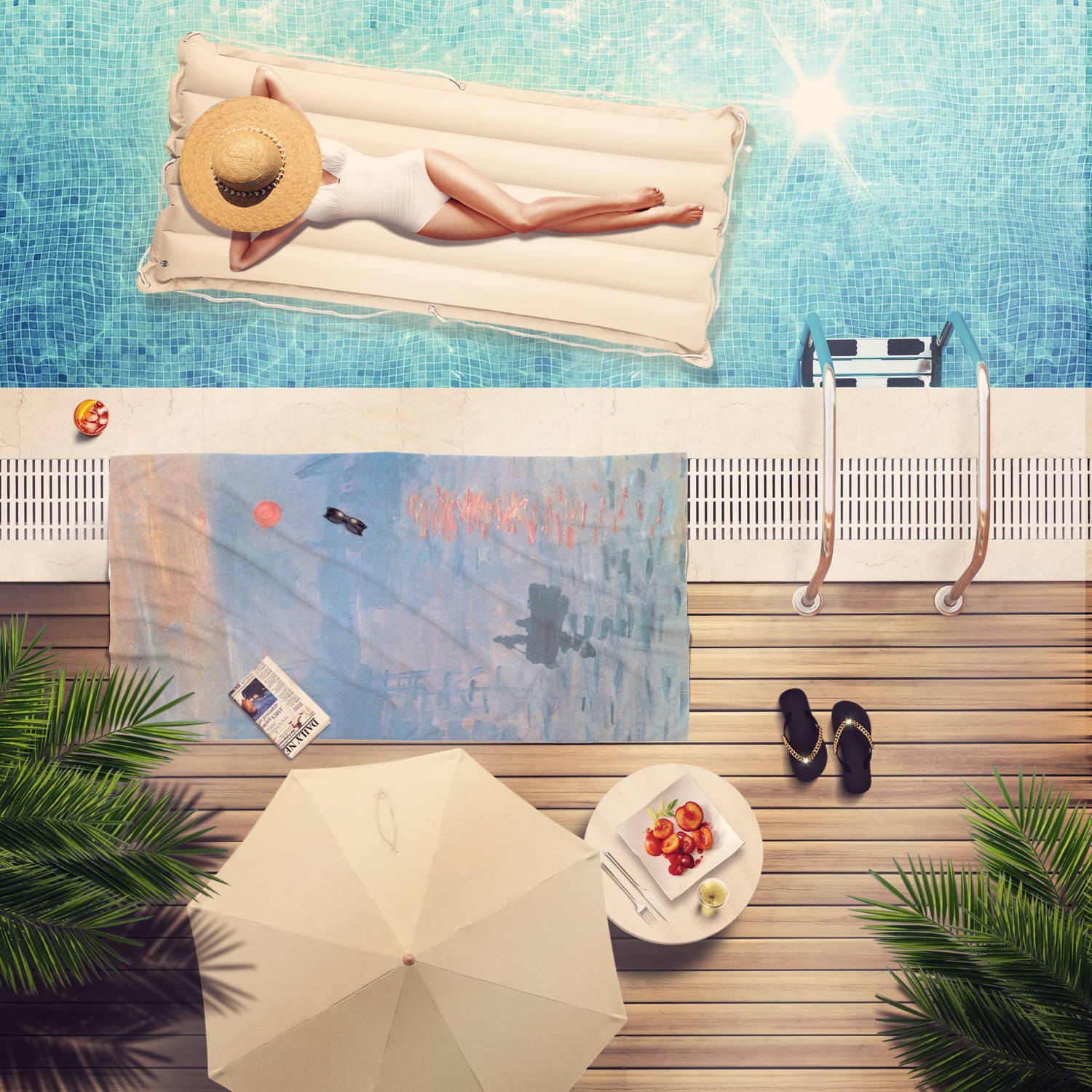 This beautiful painting, or a piece of this painting, will go quite nicely on any product of your choosing. The color palette will surely bring a calming sensation to whatever is decorated with this classic piece. If you love France, water, sunrises, or just the color blue, this design is the perfect choice for you.