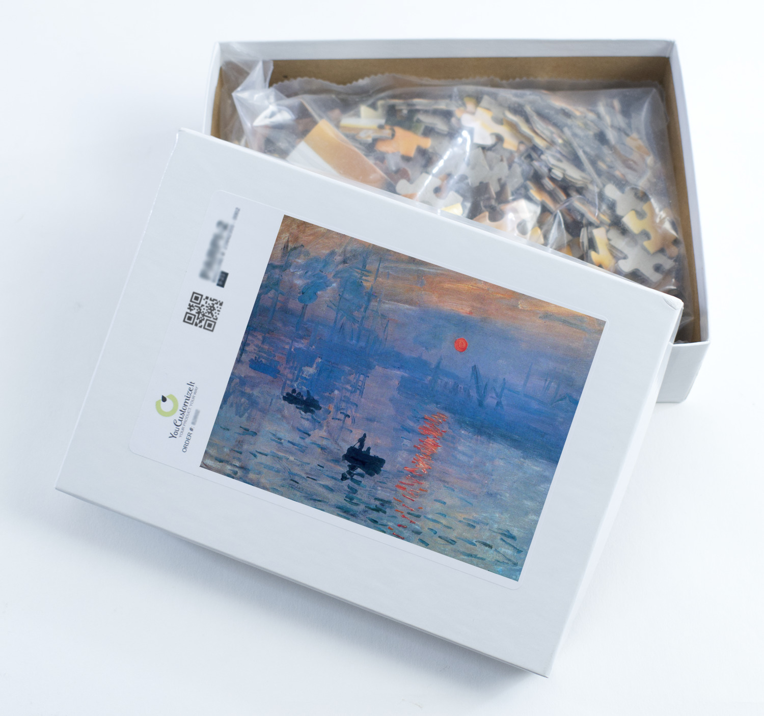 We print our puzzles on thick white chipboard in vibrant colors, then laminate the chipboard and die cut your puzzle. Your jigsaw puzzle is shipped to you in a box with the image of the puzzle on the box.