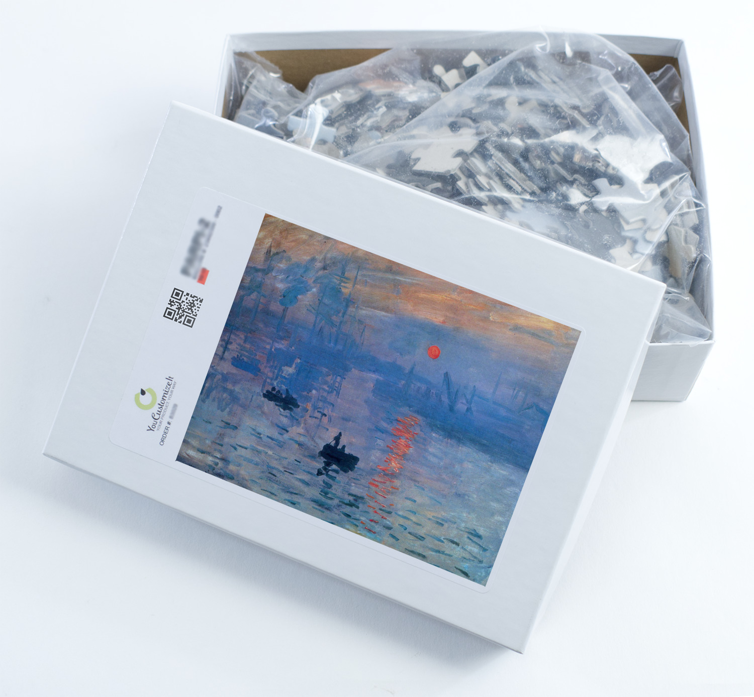 We print our puzzles on thick white chipboard in vibrant colors, then laminate the chipboard and die cut your puzzle. Your jigsaw puzzle is shipped to you in a box with the image of the puzzle on the box.