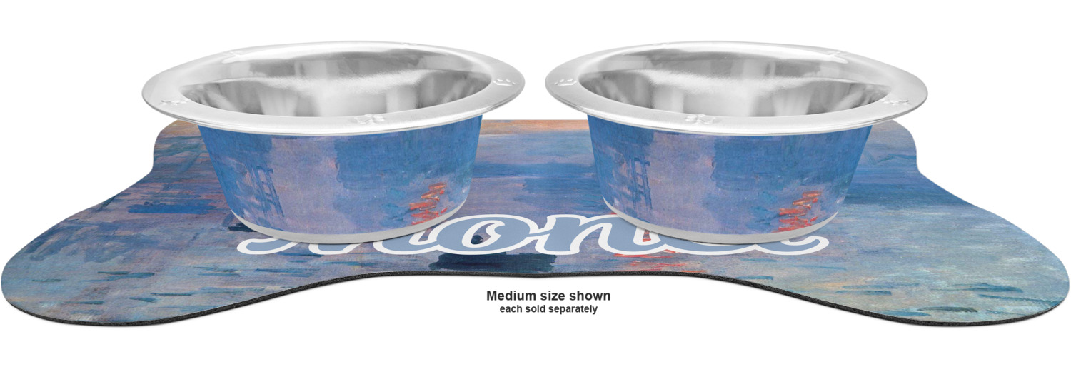 The top of this mat displays your custom design, as it is printed on polyester. To prevent slippage, the underside of the mat is made of rubber. We offer a small dog food mat, suitable for smaller dogs and a large dog food mat for bigger breeds. The small dog food mat is approximately 19 by 13 inches, while the large dog feeding mat measures at approximately 26.75 by 18 inches. Both personalized mats are ideally sized to fit two dog bowls.