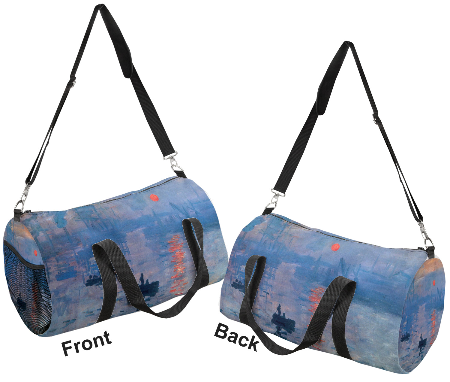 This duffle is a sturdy bag made of a canvas material. It comes in two sizes: Small (19"W x 9.5"H x 9.5"D) and Large (23"W x 12"H x 12"D). The bag is a cylindrical shape with a black adjustable strap and two handles. On one side is an elastic pouch to put a waterbottle or other small item. Your product will be sublimated with your design and is able to be designed on the front, back, and sides. Be sure to remember that the straps may cut into parts of your design if you upload your own artwork.