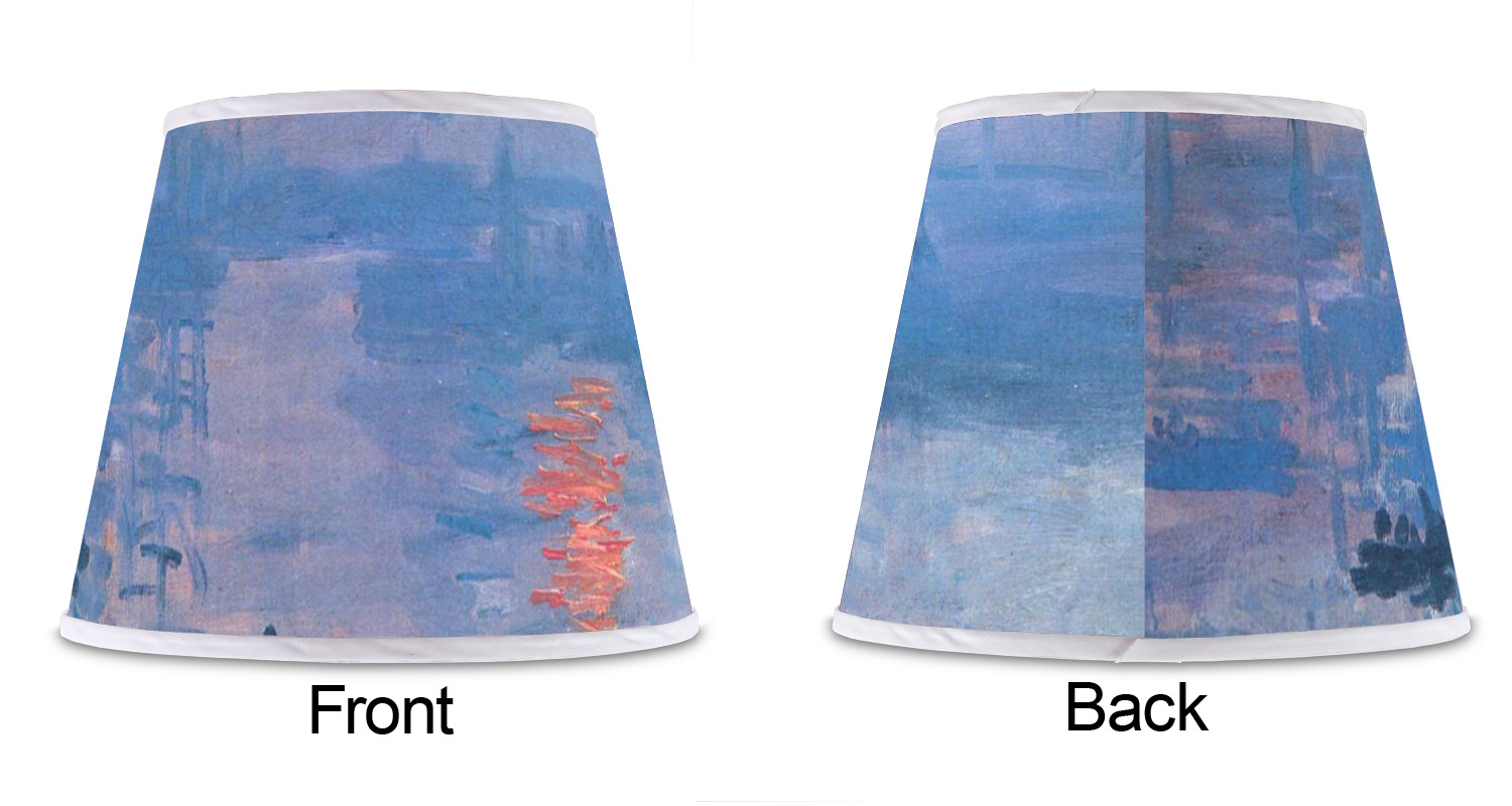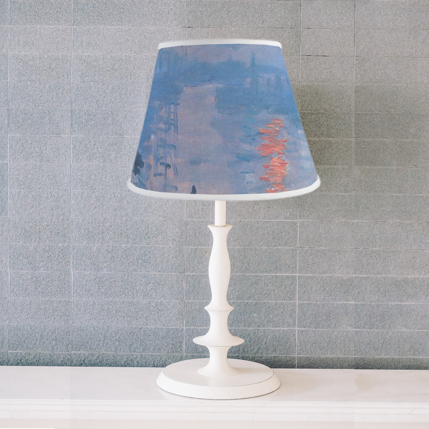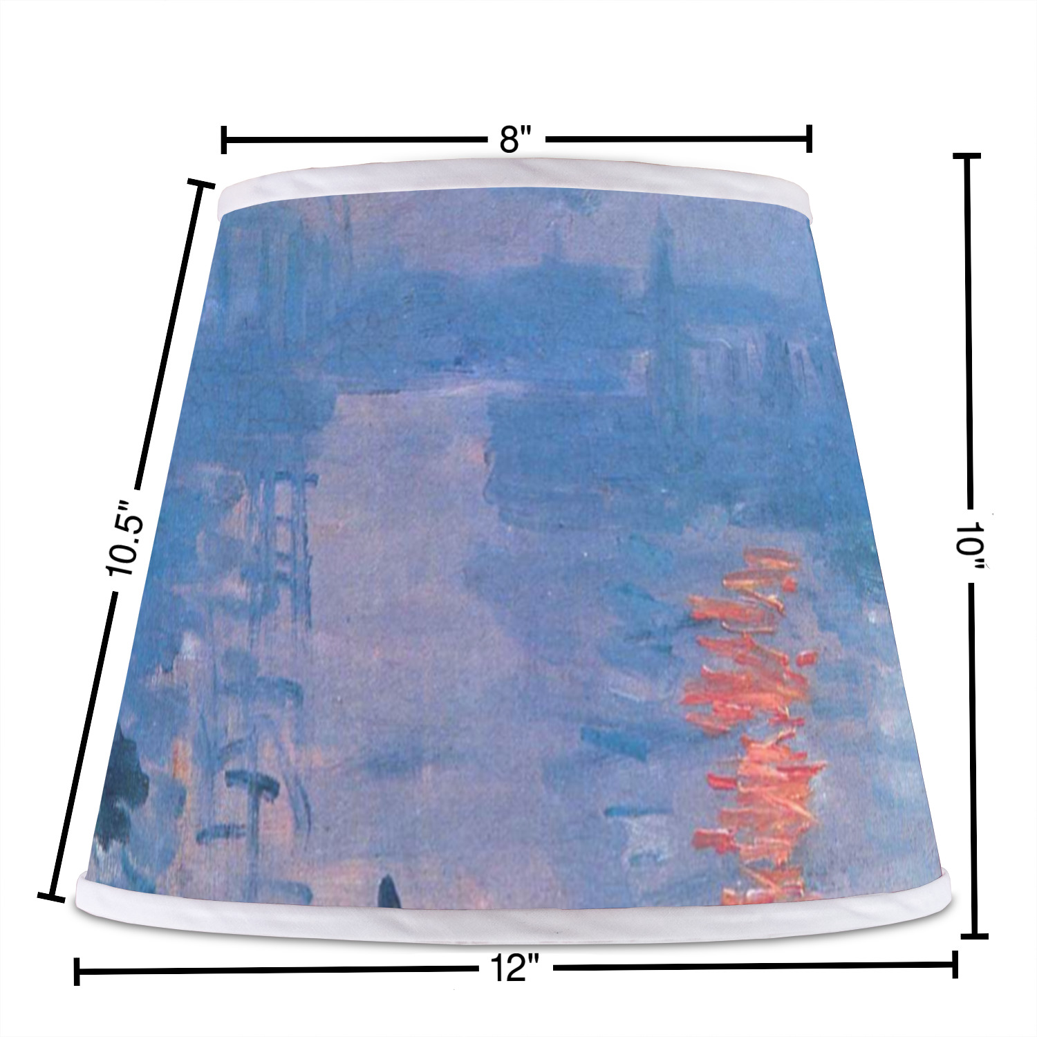 The base of this lampshade is 12 inches in diameter, and the top spans 8 inches in diameter. The total height of the lampshade is 10 inches. The angled nature of this custom lampshade concentrates the light, making it ideal for smaller spaces. This lampshade is made of matte, polyfilm, and displays your customization in its middle. The top and bottom of this colorful lamp shade are lined with a white fabric ribbon (which can be replaced with black inside the design studio) which frames your design and creates a sophisticated finish. As an UNO fitter lampshade, this unique lamp shade will fit a variety of bases.