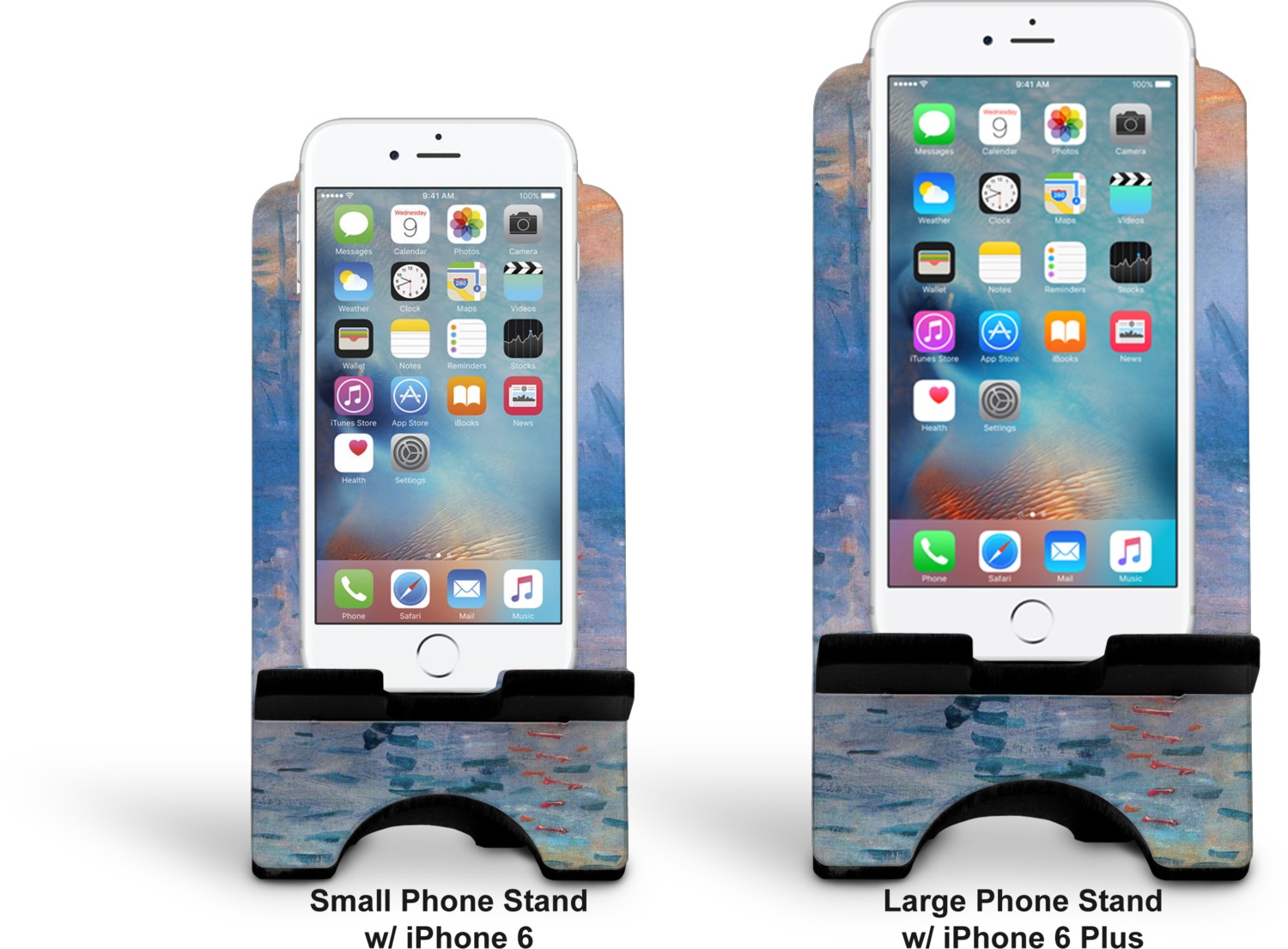 To meet your needs, we offer four variations of this IPhone stand. The backboard of the first version is shaped as a plain, yet sleek rectangle, and is available in two sizes. Our smaller size is approximately 4 by 3.25 by 7 inches, while the larger model is 4 by 3.77 by 8.5 inches. Alongside this model, we also provide you with a more decorative option. The upper part of our second version features a curved edge, for a classy, suave appearance. This phone holder is also sold in two sizes: a smaller version, which is 4 by 3.25 by 7 inches, and our larger model, which is 4 by 3.77 by 8.5 inches. Both models will support large phones, but the larger model is better if you wish to proudly display your personalized design.