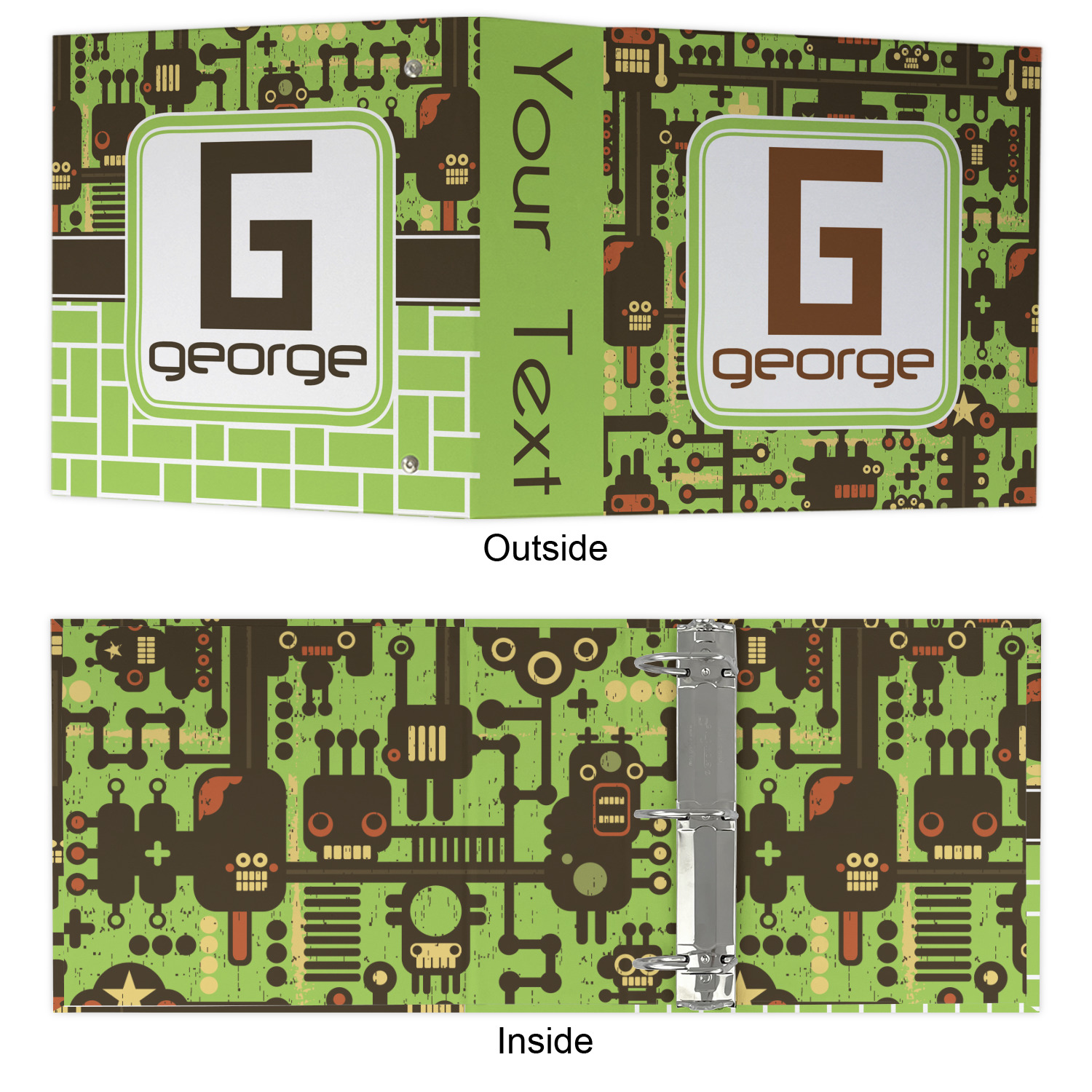 The outside is printed in 3 sections - front cover, spine and back cover - while the inside is printed in a full single print of your choice. The inside boasts a high quality nickel plated binder mechanism with a trigger opening function and is secured to the cardboard binder with posts and screws.