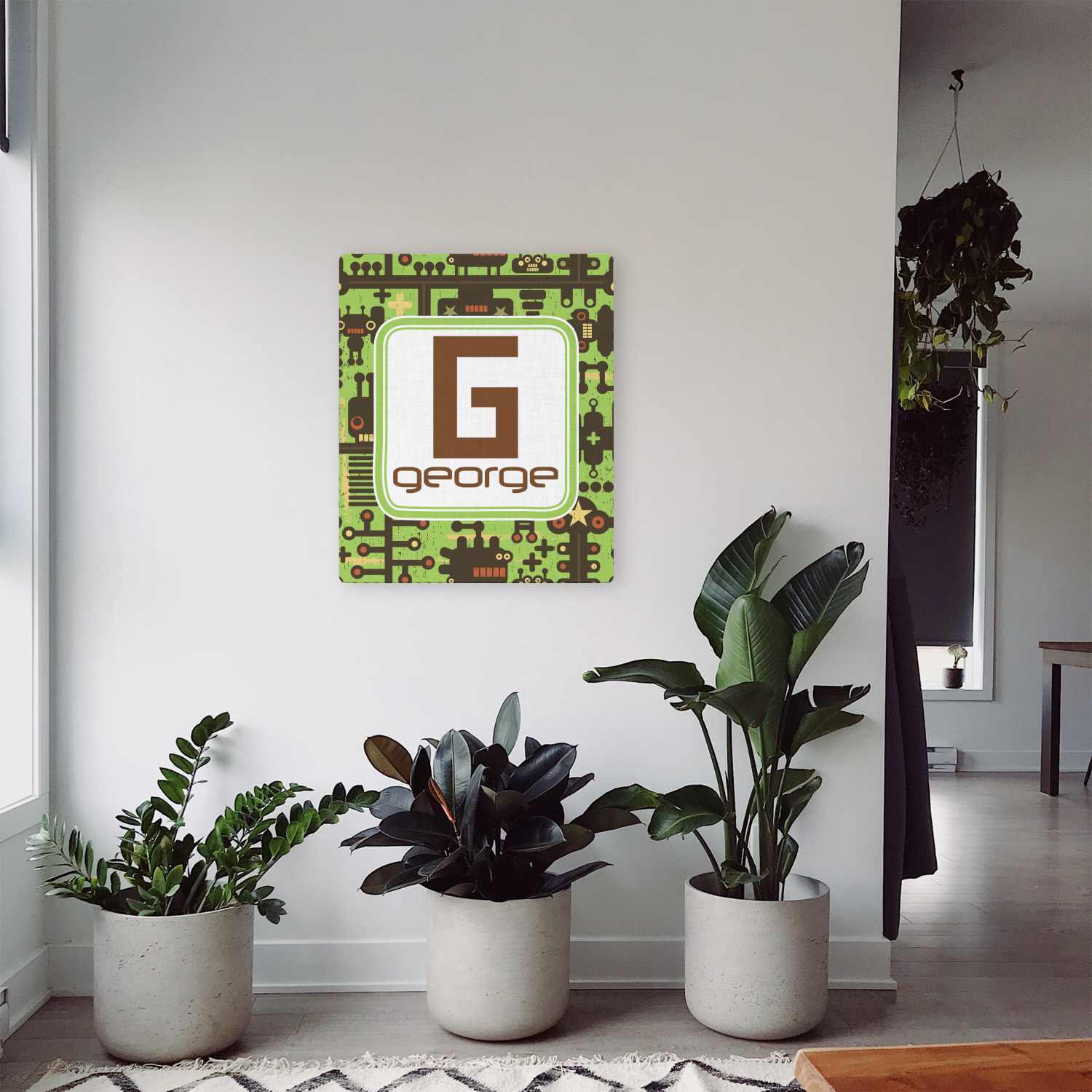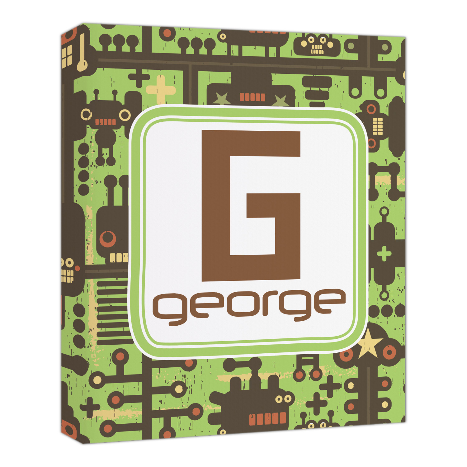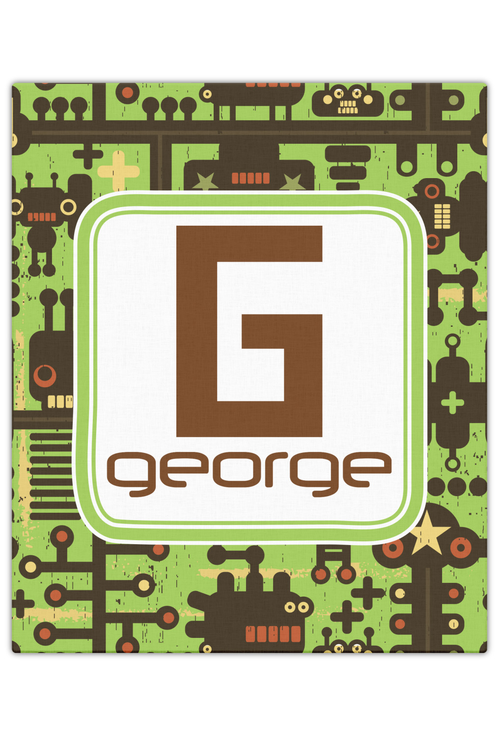 These retro robots will delight your little one and might even inspire their imagination! Brown robots of various sizes and shapes are set on a bright, lime-green background, with cool pipes and wiring adding to the whimsy.
