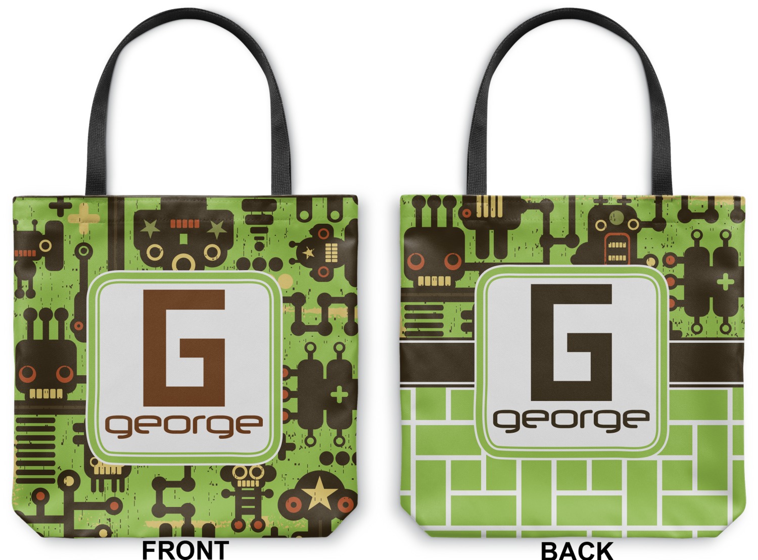 Our totes are made right here in the USA. Your design is printed on canvas fabric; the fabric is then cut and sewn on the sides and on the bottom to add an approximately 3.5 inch gusset. Black cotton handles are sewn in and reinforced. Your tote has a designs on both sides - the designs can be the same or different - the choice is yours. The inside of the tote has a black fused lining.
