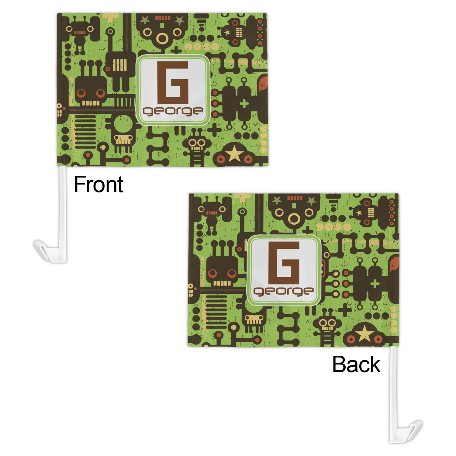 Our personalized flags are made from a durable, yet lightweight cloth that will proudly bear your logo or design of choice, while withstanding the outside elements. We have two size options - 8" x 11" and 11" x 15". Both come with a flag pole which includes a clip that secures the pole to the side window, whether it is rolled up or down. The flags are printed on both sides to display your design from all directions.
