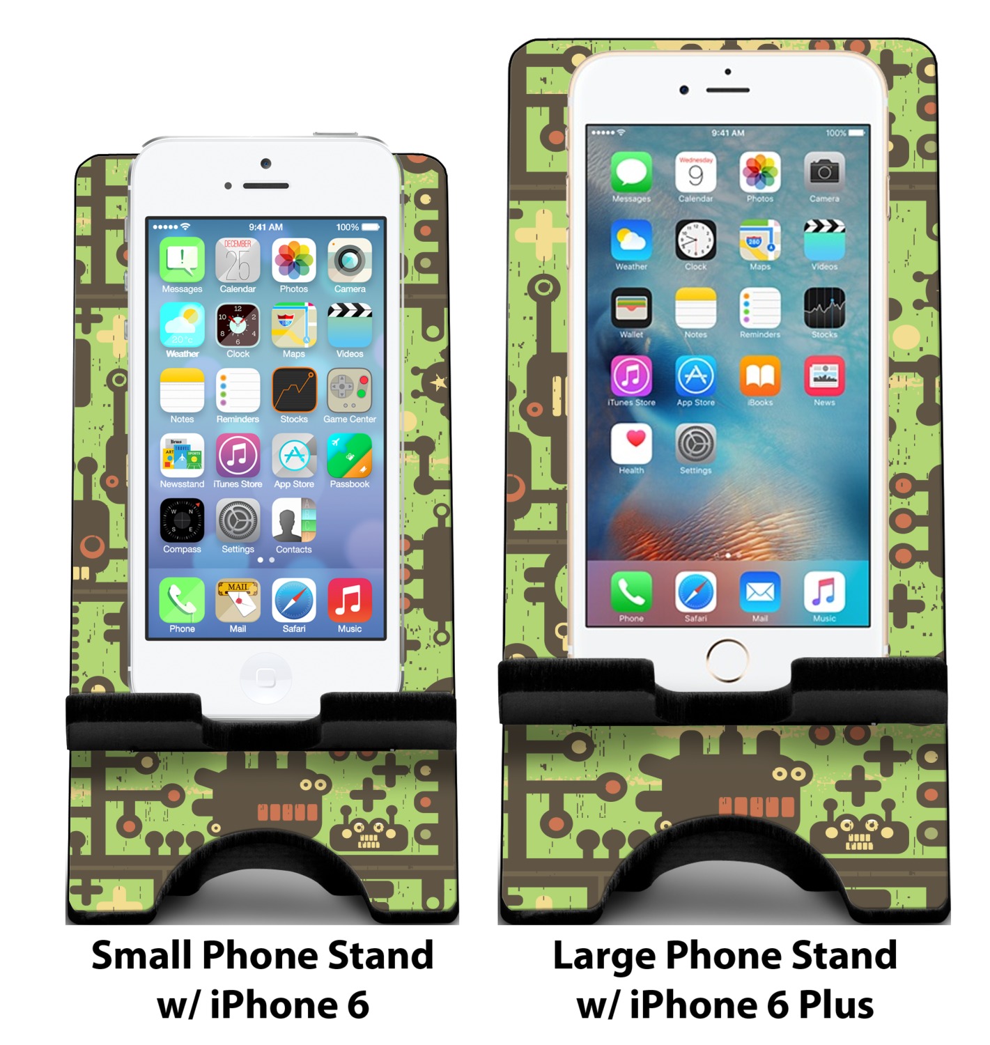 To meet your needs, we offer four variations of this IPhone stand. The backboard of the first version is shaped as a plain, yet sleek rectangle, and is available in two sizes. Our smaller size is approximately 4 by 3.25 by 7 inches, while the larger model is 4 by 3.77 by 8.5 inches. Alongside this model, we also provide you with a more decorative option. The upper part of our second version features a curved edge, for a classy, suave appearance. This phone holder is also sold in two sizes: a smaller version, which is 4 by 3.25 by 7 inches, and our larger model, which is 4 by 3.77 by 8.5 inches. Both models will support large phones, but the larger model is better if you wish to proudly display your personalized design.