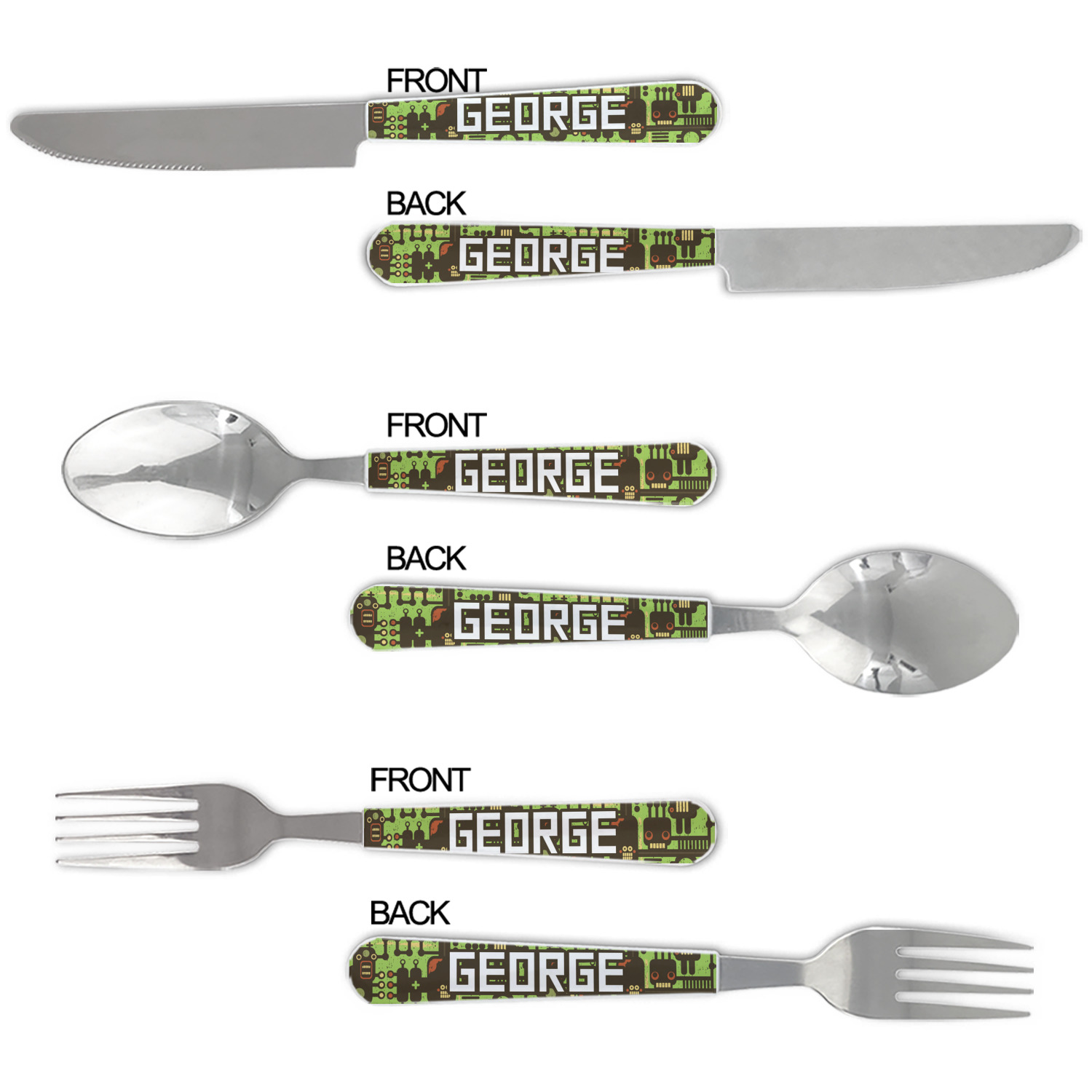 One of those items we all use on a daily basis and never give it much thought - cutlery. Having your own customized set of cutlery adds that special touch. A great addition to our custom plates and drinking pint glasses, this flatware set can be made in the same patterns to match.