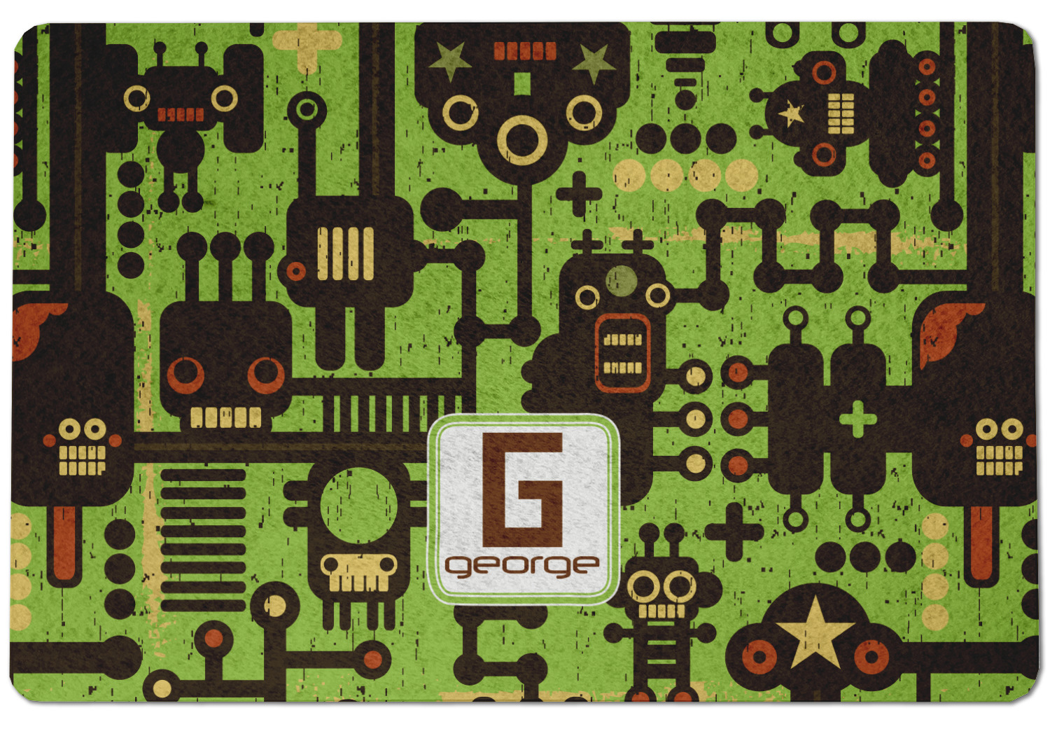 These retro robots will delight your little one and might even inspire their imagination! Brown robots of various sizes and shapes are set on a bright, lime-green background, with cool pipes and wiring adding to the whimsy.