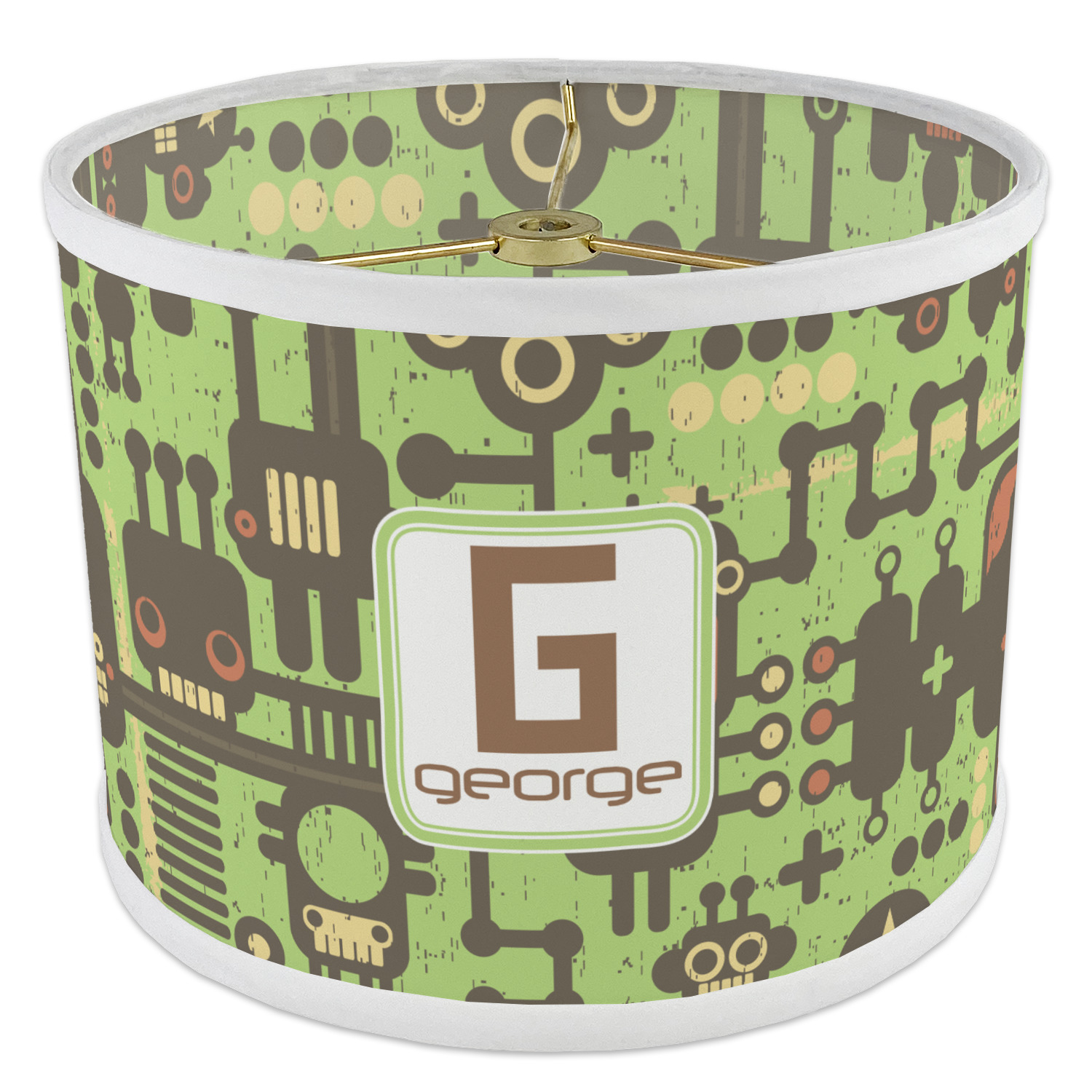These retro robots will delight your little one and might even inspire their imagination! Brown robots of various sizes and shapes are set on a bright, lime-green background, with cool pipes and wiring adding to the whimsy.