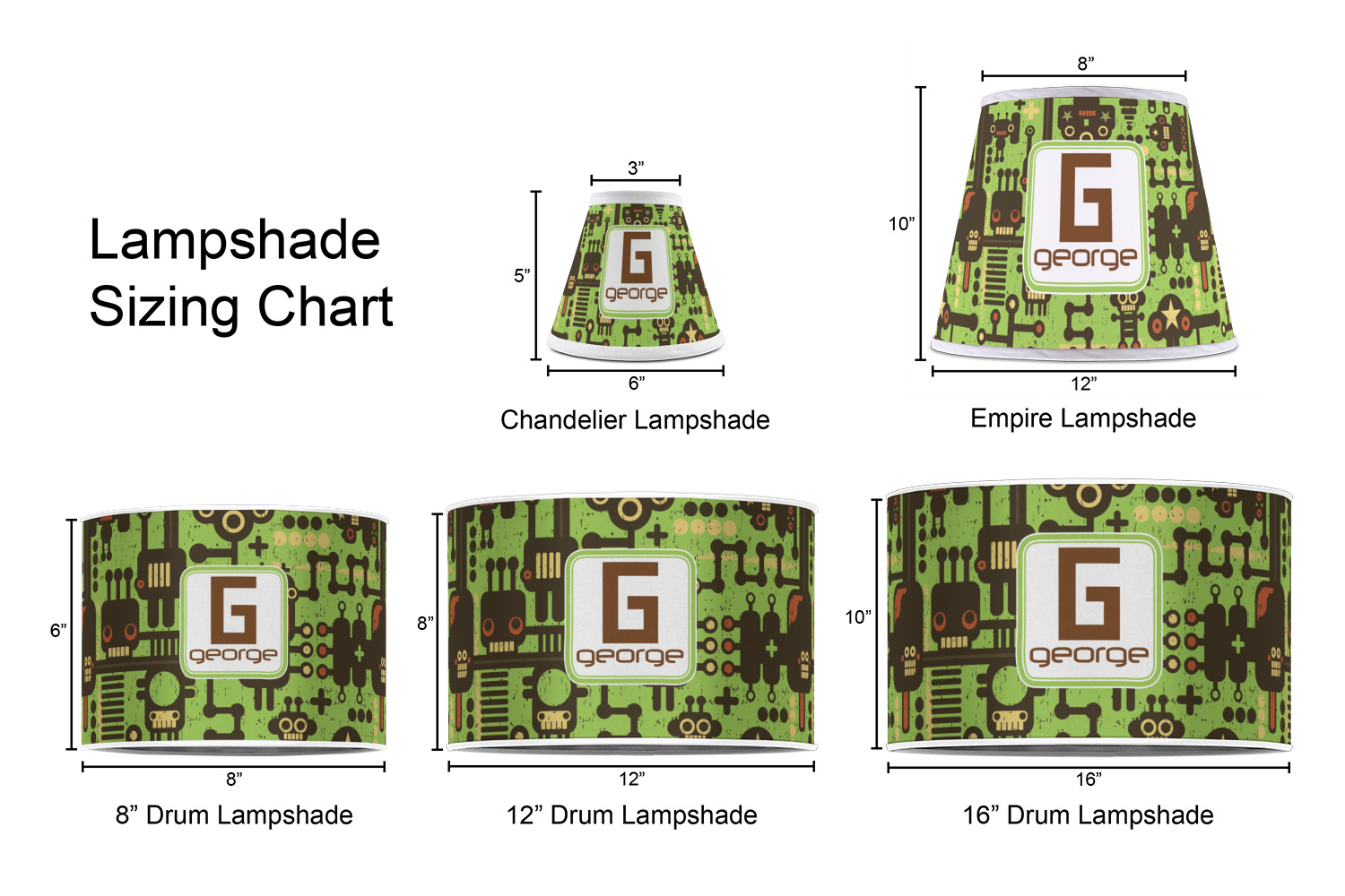 Our customized lamp shades also come in 3 different sizes: 8", 12" and 16", measuring at 8" in diameter by 6" tall, 12" in diameter by 8" tall, and 16" in diameter by 10" tall, respectively.
