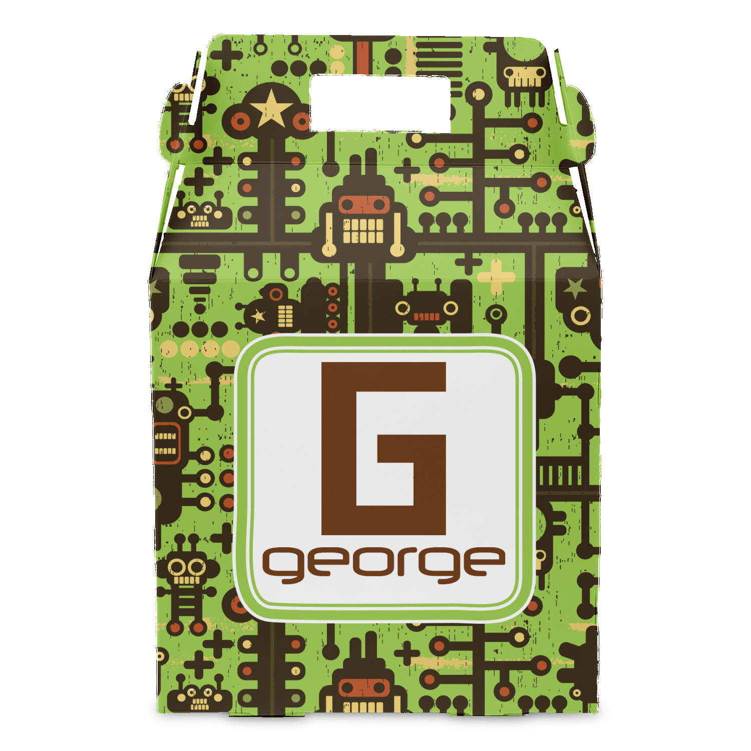 These retro robots will delight your little one and might even inspire their imagination! Brown robots of various sizes and shapes are set on a bright, lime-green background, with cool pipes and wiring adding to the whimsy.