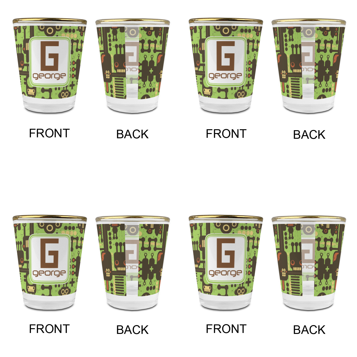 Made with frosted glass, these shot glasses are printed in full color with the design of your choice. They are a standard 1.5oz shot glass and are 2.4" tall. The print is wrapped around the shot glass in a full wrap and boldly displays your customization.