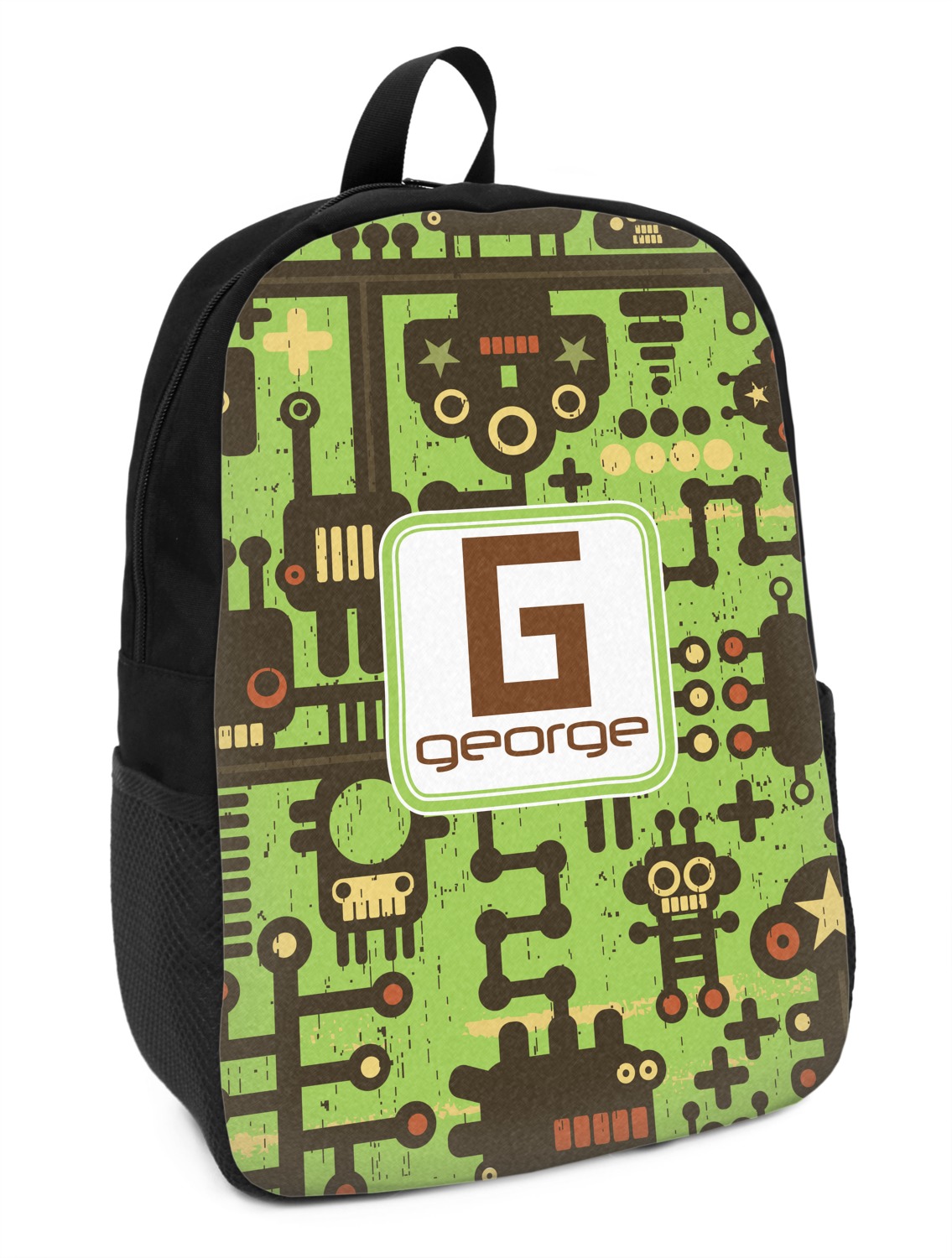 These small backpacks are made of a durable black canvas material with your personalization right on the front. The two shoulder straps are padded and easily adjustable. The bag itself measures at about 11" W x 15" H x 5" D. It's the perfect size for elementary aged kids or adults who want a smaller backpack. On the top of the bag you will find a handle to hang or carry your backpack by as well as a large zipper closure to keep all of your belongings safe inside. On each side of your backpack is a mesh pocket for a small item or water bottle. Inside your backpack you will find a spacious area with a small zipper pocket and a padded laptop slot that will fit up to a 13" laptop (13" being very snug). This is the perfect bag for any student that needs a couple books and their laptop with them at all times. It also works great as a carry on for traveling!