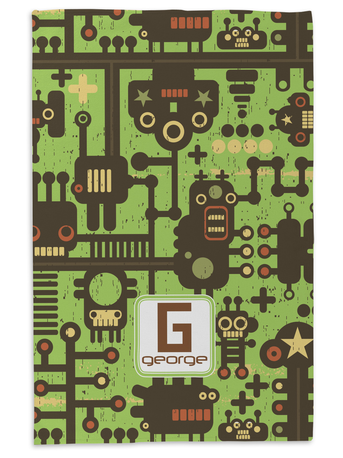 These retro robots will delight your little one and might even inspire their imagination! Brown robots of various sizes and shapes are set on a bright, lime-green background, with cool pipes and wiring adding to the whimsy.