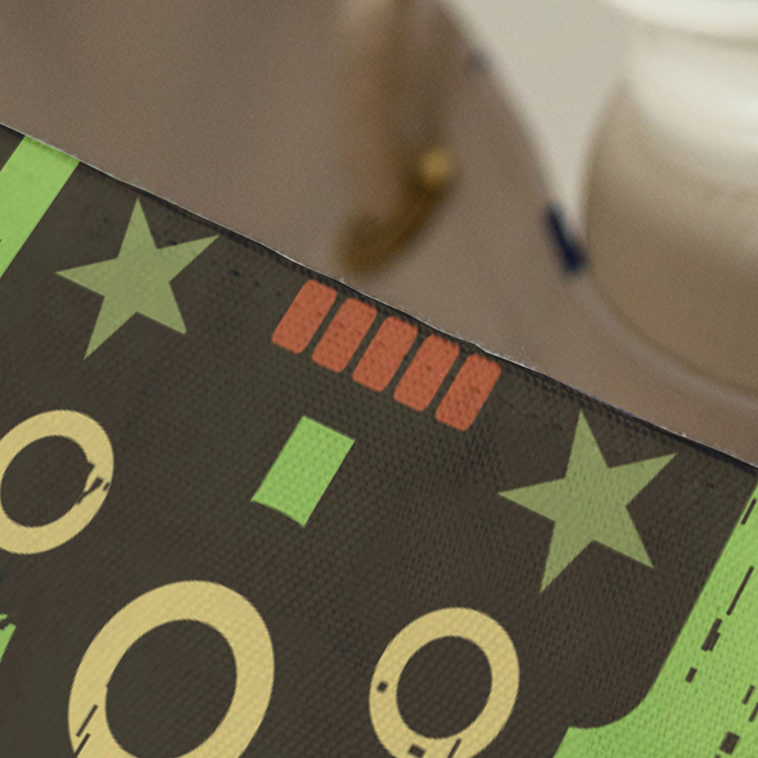 These retro robots will delight your little one and might even inspire their imagination! Brown robots of various sizes and shapes are set on a bright, lime-green background, with cool pipes and wiring adding to the whimsy.