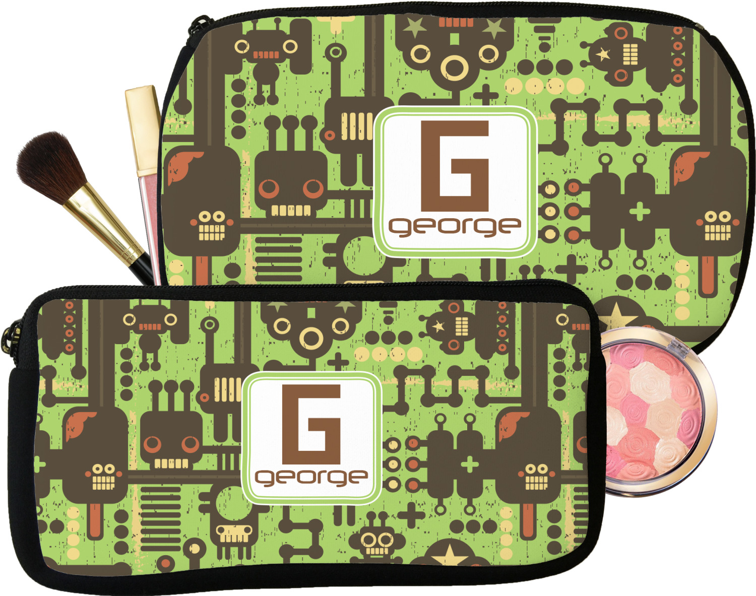 Our personalized makeup bags are available in many different designs, patterns and colors - so you are sure to find one that will love. They are made of neoprene (same material as wet-suits) and thus are water resistant, so spillages in your makeup bag will not end up all over you purse. They are customized on one side and are black on the other side and the zipper is black as well.