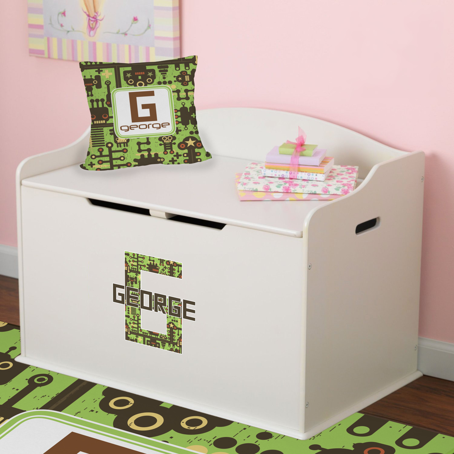 These retro robots will delight your little one and might even inspire their imagination! Brown robots of various sizes and shapes are set on a bright, lime-green background, with cool pipes and wiring adding to the whimsy.