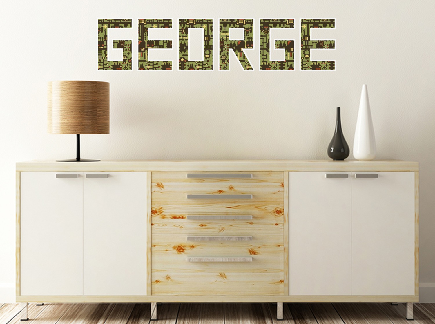These retro robots will delight your little one and might even inspire their imagination! Brown robots of various sizes and shapes are set on a bright, lime-green background, with cool pipes and wiring adding to the whimsy.