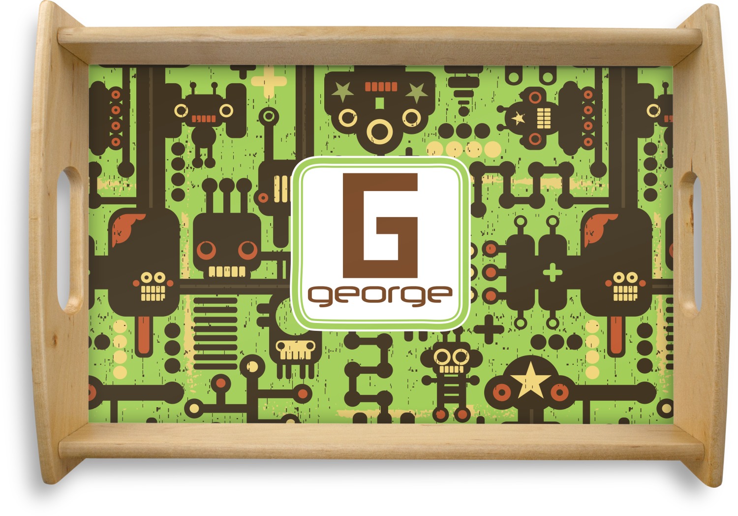 This serving tray with handles features square edges and two rounded sides, creating a very modern look. Each side is fabricated from a beautifully cut, natural wood. The bottom of the interior of the tray displays your customized design in bright, vibrant color. The tray is sold in both a black color and a natural wood look. Each variation of the wood serving tray has two sizes: Small, which is 14" x 10" x 2.25", and Large, which is 19.5" x 13.5" x 2.75".