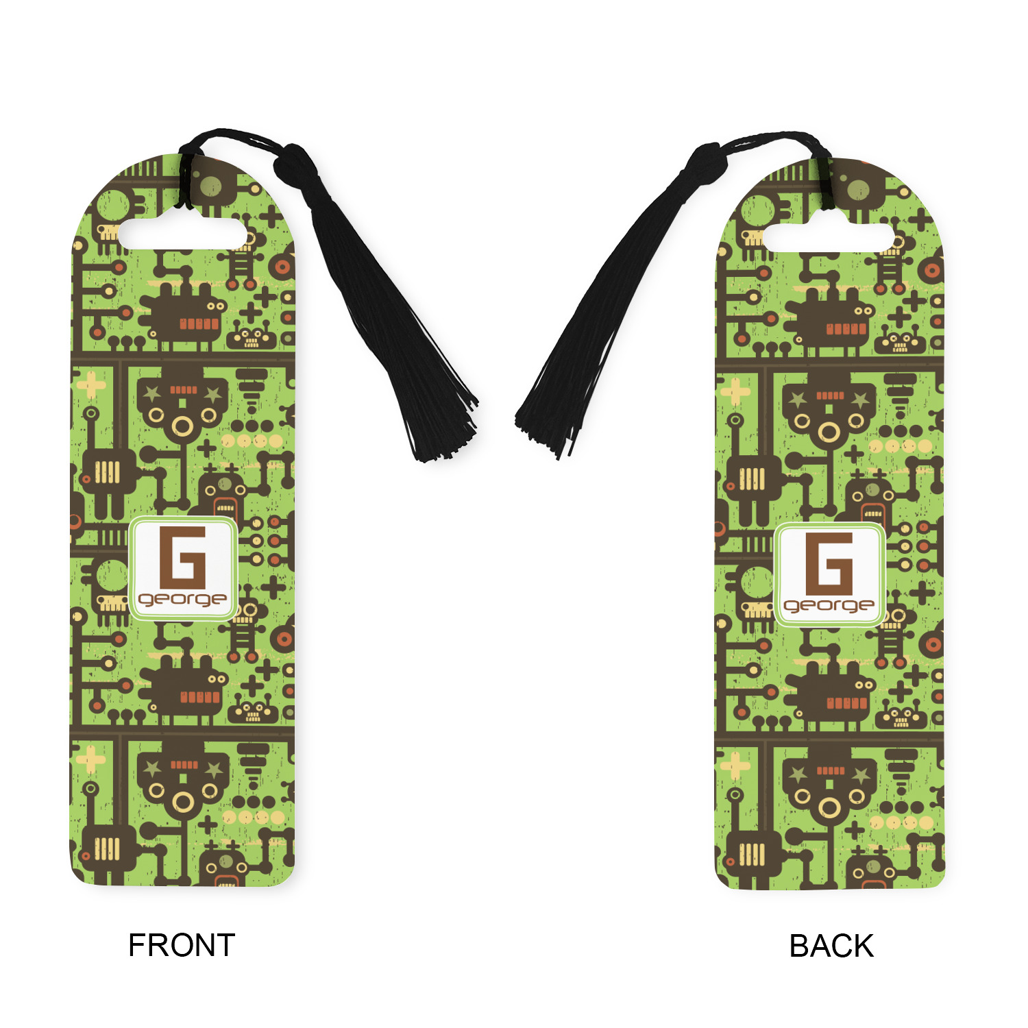 Made from a durable, flexible plastic, these bookmarks are printed with your custom design on them. With the tassel on them they make it easy to find your page in your book. These are a rectangular shape 7 1/4 inches tall with a rounded top and are approximately 2 1/4 inches wide.