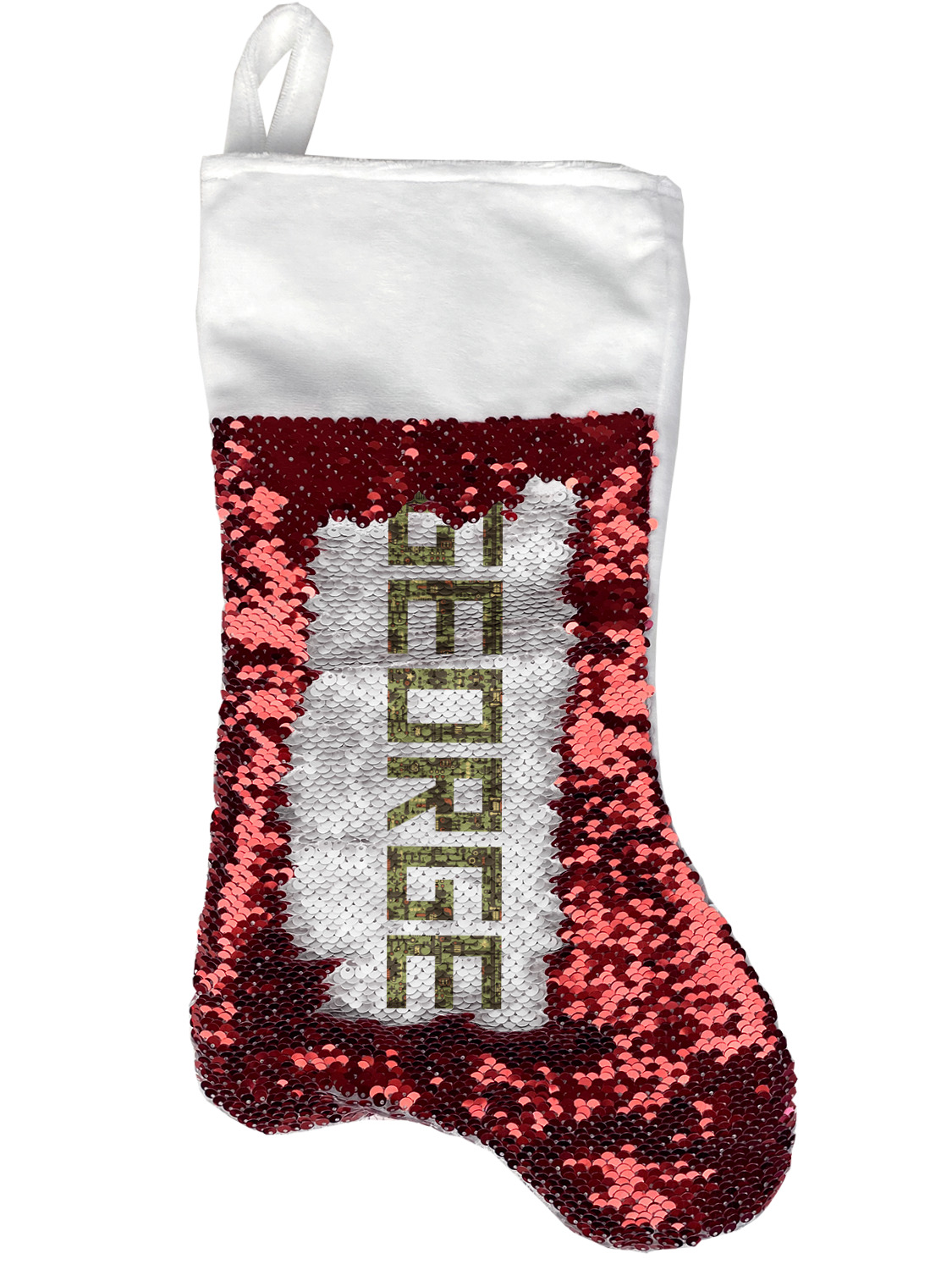 Our fun sequin stockings are made from a soft, yet durable polyester material perfect for any stocking stuffer or holiday decor! Choose from a glamorous gold stocking or classic red sequin stocking for the front color and have your personalized image printed behind for reversible fun! Our sparkly sequin stockings are super fun and decorative perfect for the family and you this holiday! Each stocking is approximately 17" x 9" with a durable loop for hanging and printed here in the US.