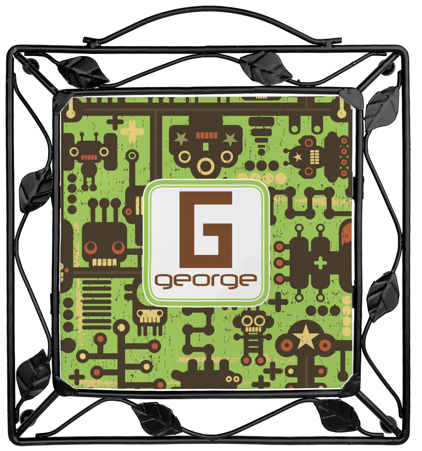 Our square trivets are made from a durable, wrought iron. This model features 4 small half circles, one on each corner, and a larger ring of iron that circles the central, customized tile. Each of the 4 corners has a round foot on its bottom for stability. This trivet is 8.75 by 8.75 inches, but the central tile measures at 6 inches on both sides.