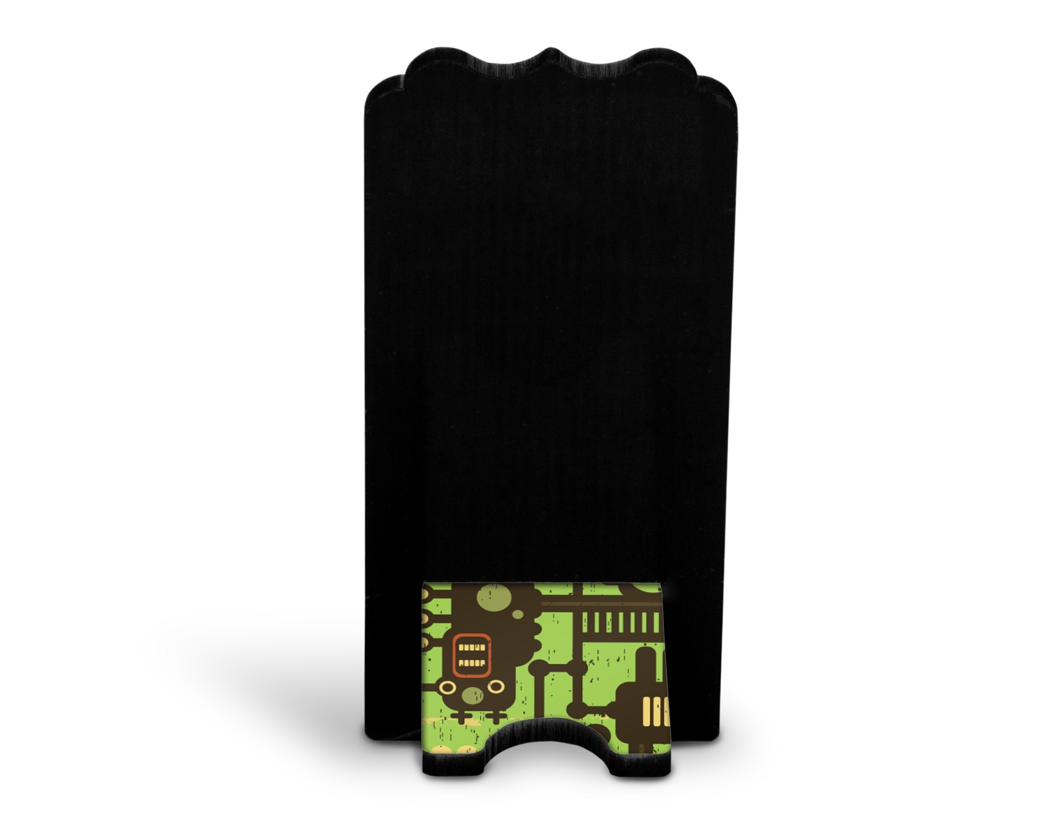 These cell phone holders are comprised of two hardboard pieces, that lock into and steady one another. The bottom part of the mobile phone stand is spacious enough to support both your phone and your charger, while it is not in use. We print your customization atop the face of this stand, while the remaining sides are a sophisticated, black color.